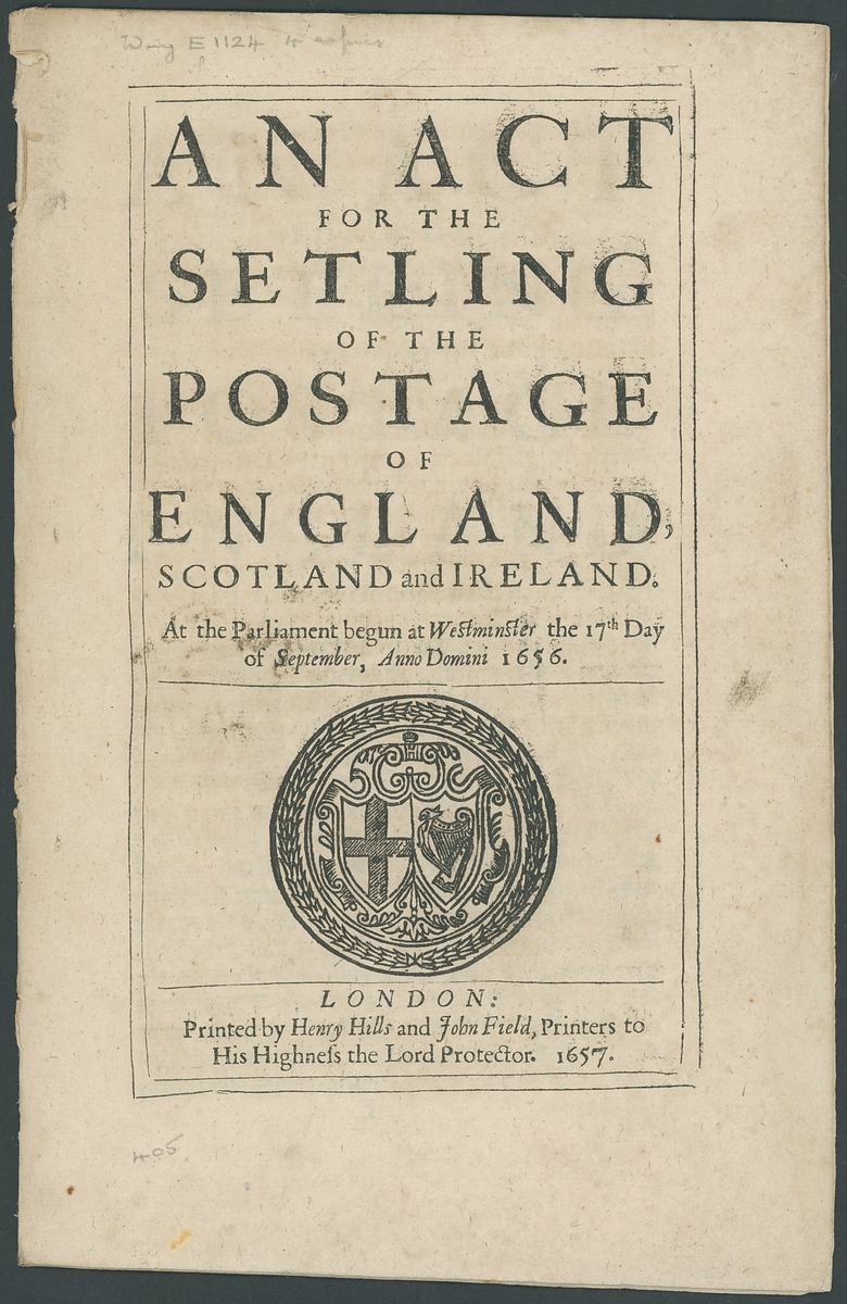 Notes: This is the first act of parliament relating to the erecting and settling of one General Post Office for the speedy conveying, carrying and re-carrying of letters by post to and from all places within England, Scotland and Ireland and into several parts beyond the seas. Be it enacted by His Highness the Lord Protector and the Parliament, that from henceforth there be one General Office, to be called, and known by the name of the Post-Office of England: and one officer under the name and stile of Postmaster General of England, and Comptroller of the Post-Office. Also setting out the rates of postage