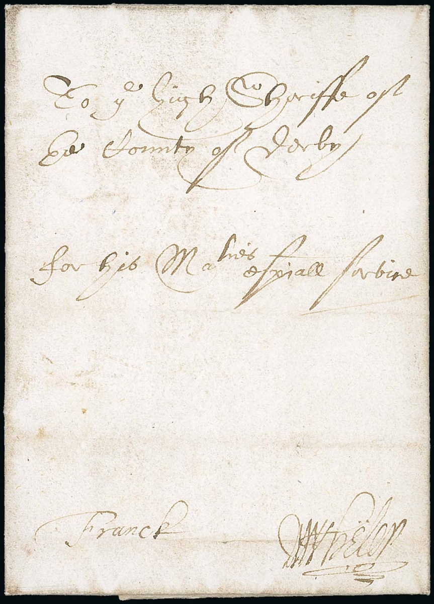 1600 (8 Nov.) entire letter from Guildhall, London with address panel reading "To ye High Sheriffe of the County of Derby", endorsed "For His Matie's Especiall Service" and Franck" (free frank) and signed "Wheler"; the letter signed "Wheler", "Thomas Rick" and "Thomas Player". This letter falls in the unusual period of uncertainty between 1660-61 in which free franking privileges were sometimes overlooked; in this case it appears that they were upheld as no charge is given. Rare.