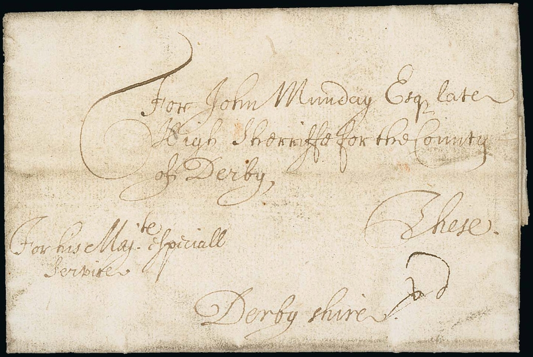 1661 (2 April) entire letter from the "Com[missione]rs for discharging the Navy" with address panel reading "For John Munday Esq. Late High Sherriffe for the County of Derby", endorsed "For his Maj'te Speciall Service" by the sender, and "Pd" by the post office. Signed "Albermarle" (Duke of Albermarle), "Rob. Scawen" and "William Prynne". This letter unusually falls in the period between 1660 and 1661, after the Restoration, in which the franking privilege was suspended, hence the charge marking. A hugely important piece.