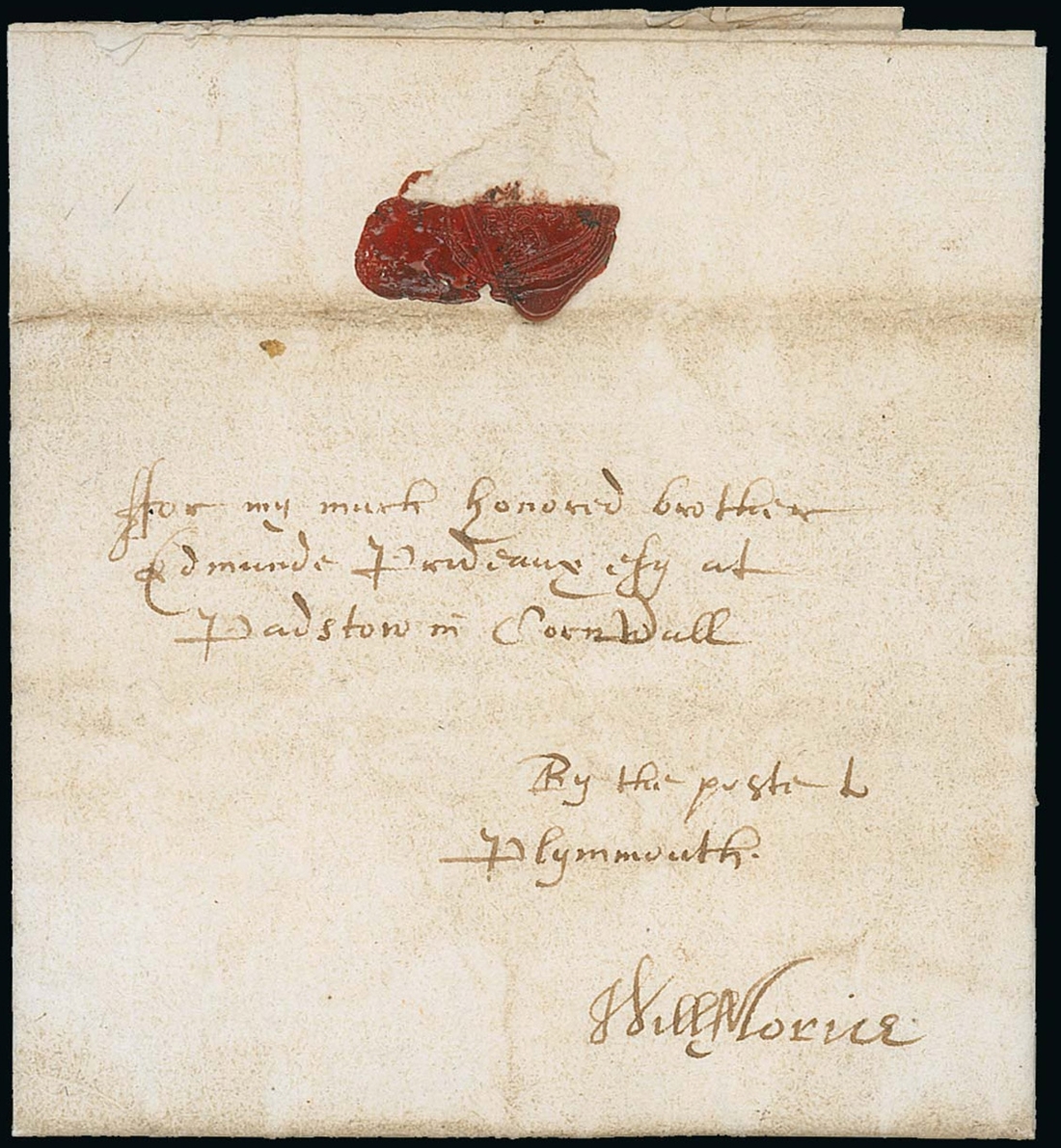 1661 (25 April) entire letter from William Morice, Secretary of State, with address panel "ffor my much honoured Brother, Edmond Prideaux Esq. at, Padstow in Cornwall, by the poste to Plymouth", signed "Will Morice" to indicate his free franking privilege; contents include mention of a £300 p.a. royal pension for his son. Dated less than a week following the introduction of the Bishop Mark and during the period of uncertainty over free frank privilege. Most interesting and rare.