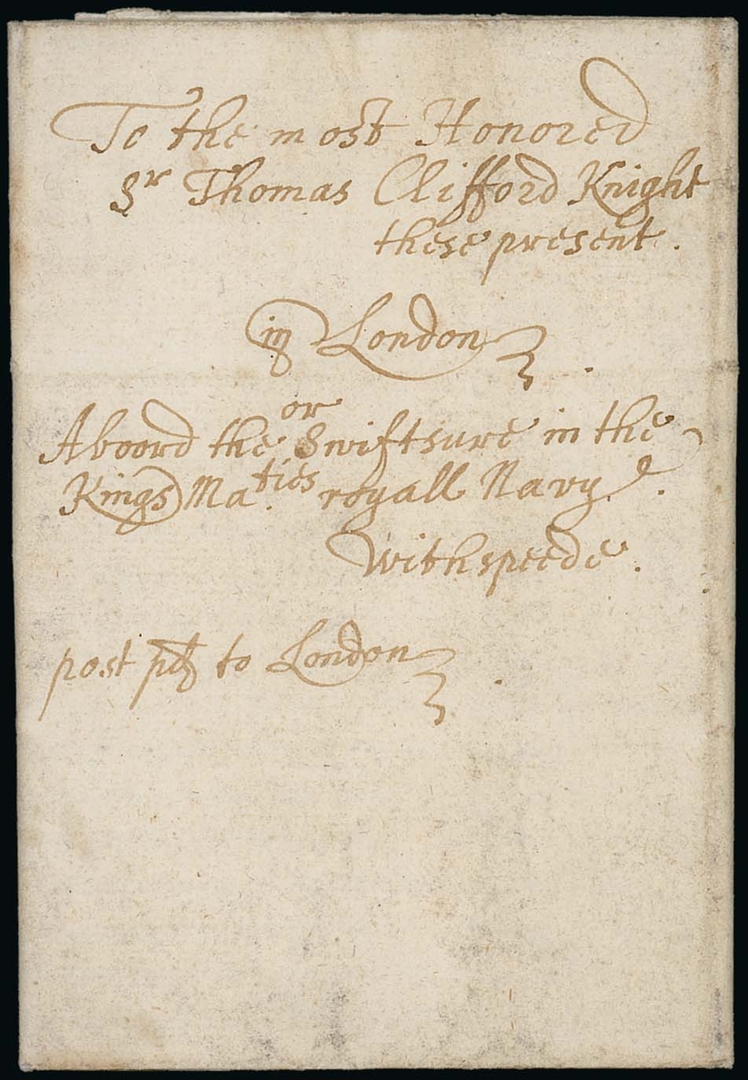 1665 (7 July) entire letter from George Chudleigh and Baldwin Ackland in Exon, with address panel reading "To the most Honored Sr. Thomas Clifford Knight, those present in London or Aboard the Swiftsure in the Kings Ma'ties royall Navy", endorsed here "With speede" and "post pd to London". Letter concerns the ongoing Naval war with the Dutch, wishing the recipient "that you may bee victorious & once more beate the Dutch soundly as soone as may bee". No postal markings are to be found; one might expect a Bishop Mark, though owing to the plague there were huge postal staff shortages. Fine and scarce.