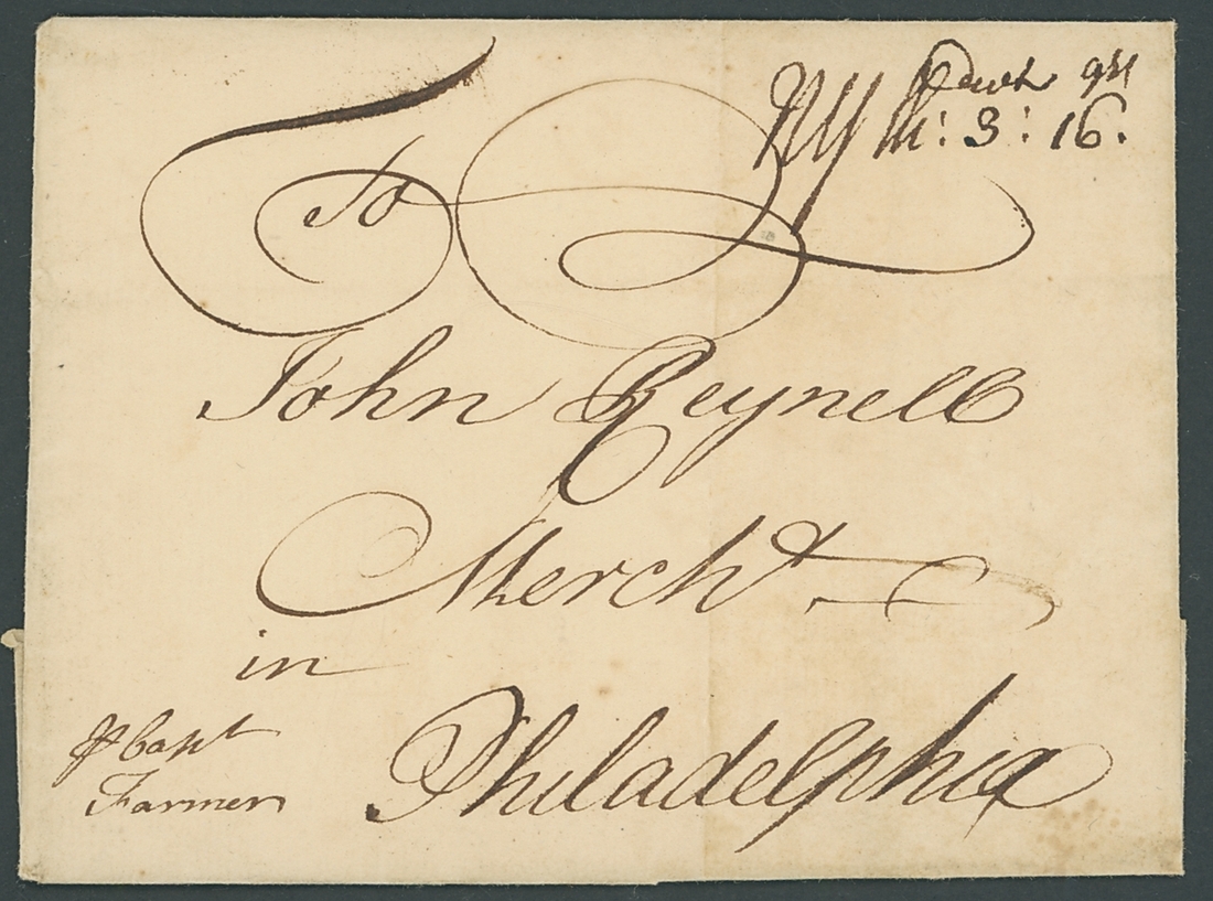 1740 ship letter wrapper from England to John Reynell in Philadelphia, carried privately "p Capr Farmer", forward from New York with manuscript rate notation in the top right corner, "NY Sh: 3dwt: 16grs"; the receipt docketing on the flap reads, "From Daniel Flexney Rec'd 30th April 1740 Via N. York". Very fresh and an exceptionally early letter to America