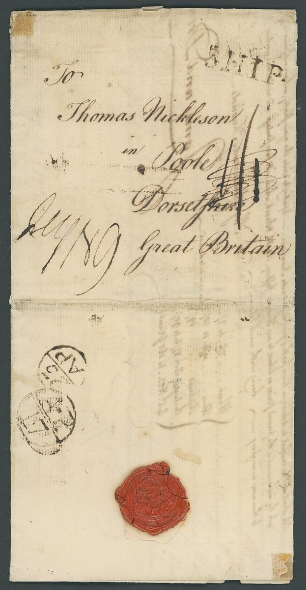 1773 (24 Jan.) entire letter from the Philadelphia, USA to Poole, rated "1/1", deleted and "1NP" with straight line "