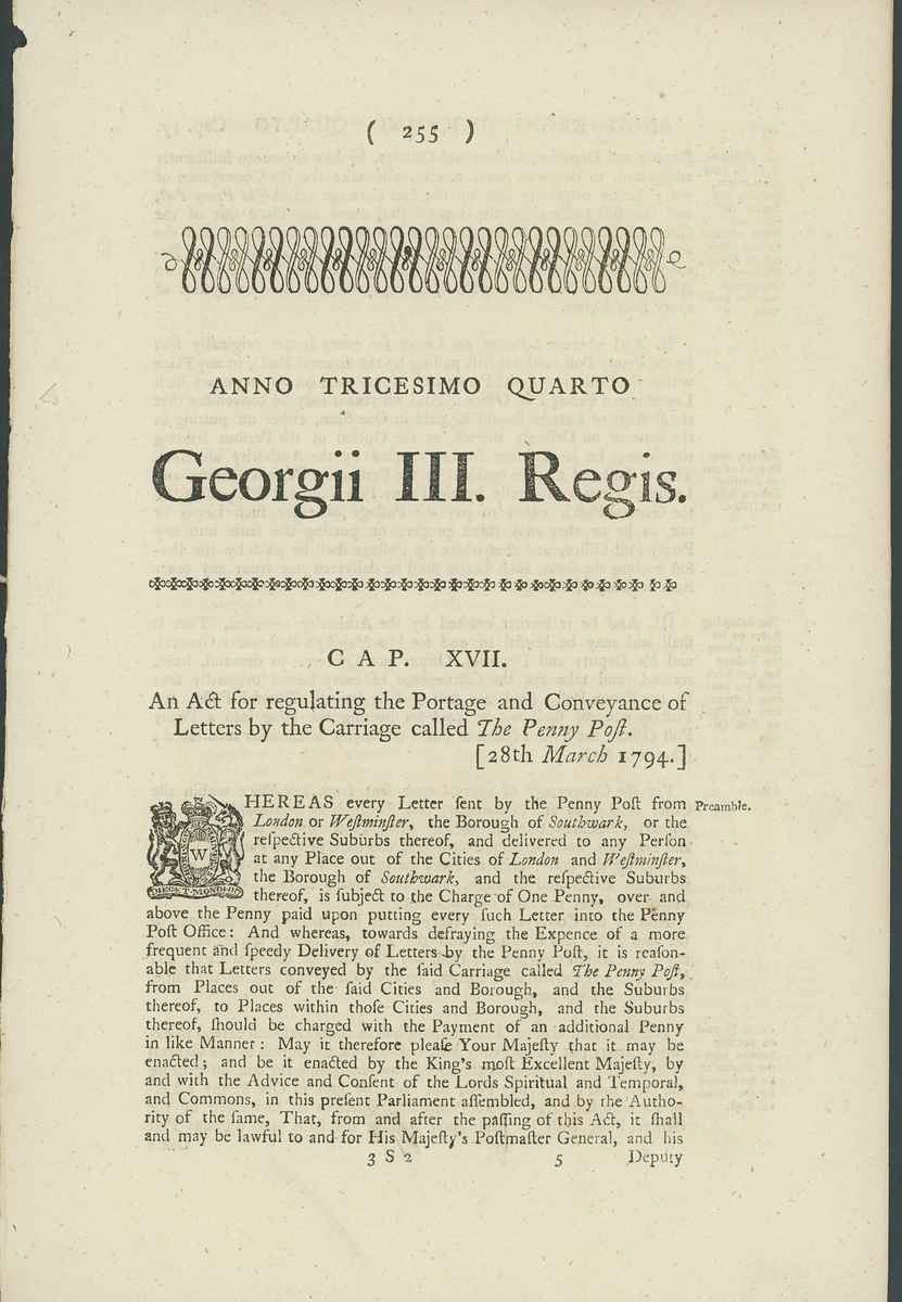 1794 (28 March) George III act [255] titled "An Act for regulating the Portage and Conveyance of Letters by the Carriage called The Penny Post. Pages complete though cover separated. An important document.