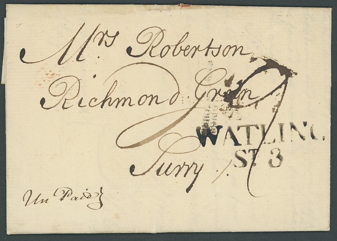 1795 (4 May) entire letter to Richmond Green, Surrey, endorsed "Un Paid", charged "9", and struck with fine "
