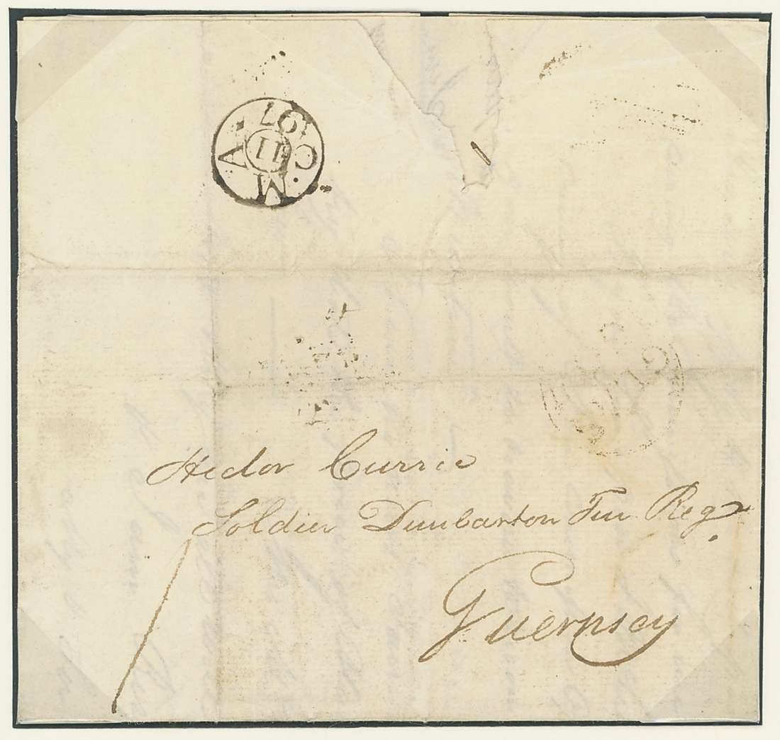 1797 (8 May) entire letter from Glasgow with address panel reading "Hector Currie, Soldier Dumbarton Fus. Regt, Guernsey", correctly posted unpaid, though unusually charged "1", the soldiers and seamen's rate on arrival, likely because the letter was addressed to an Officer and not a soldier, thus contravening soldiers' and seamens' privileges. Fine and scarce.