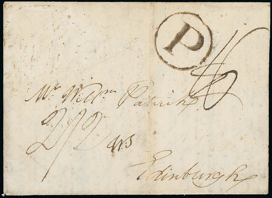 1798 (15 April), entire letter (no side flaps) from Portugal to Edinburgh, with extremely fine "P" in circle Foreign Office handstamp, rate markings; clean vertical filing fold clear of the marking. Barrie Jay states "Only a very few copies have been recorded"