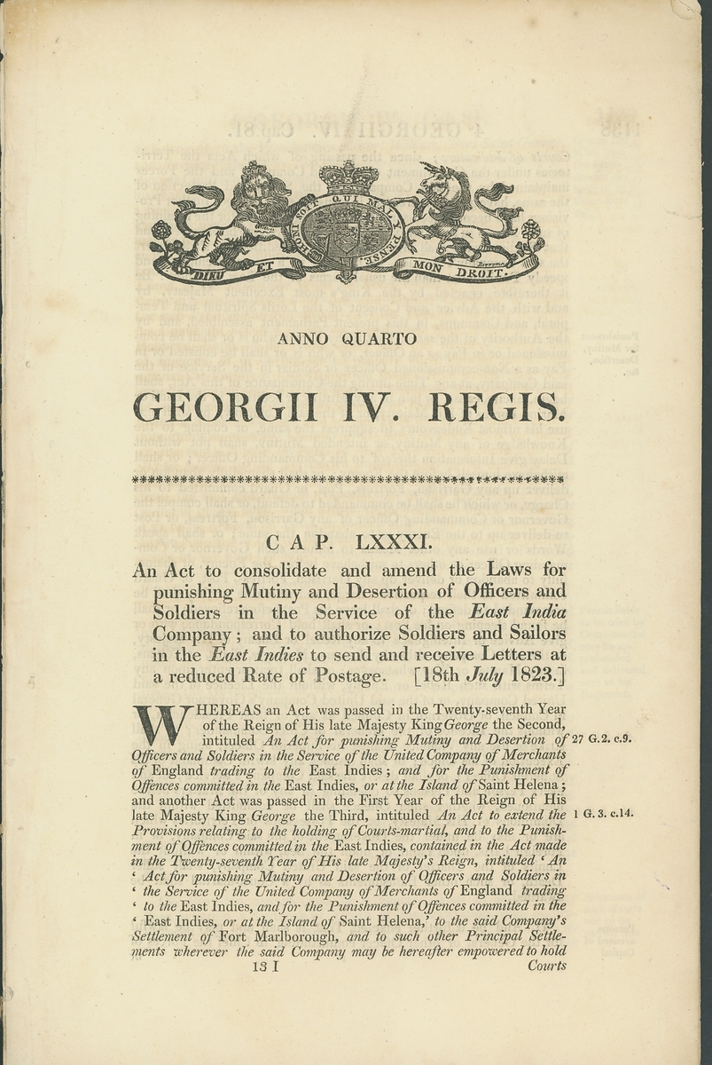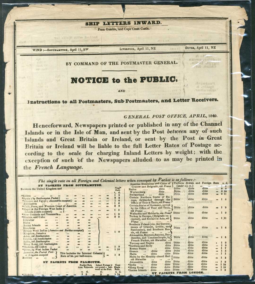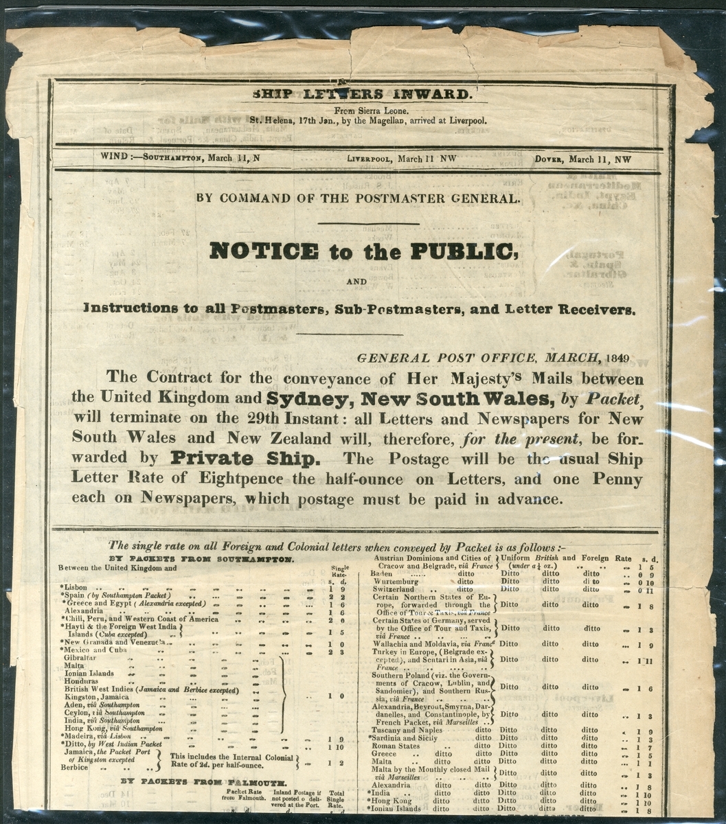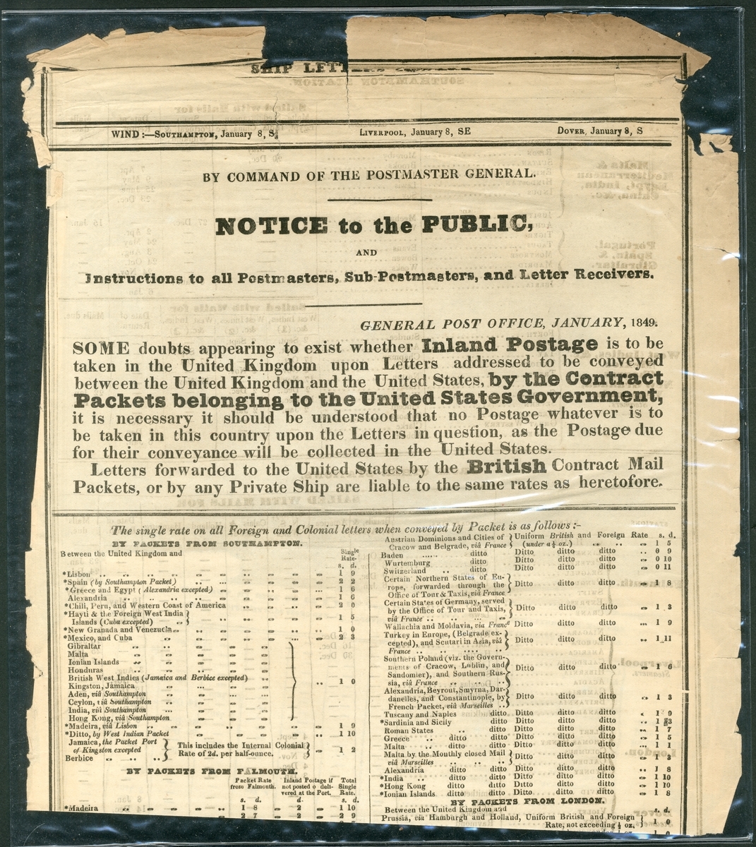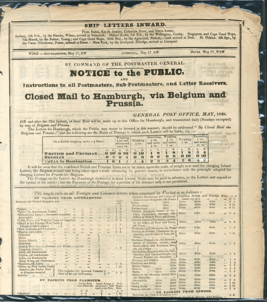 1806-49, a selection of Acts and Notices including 1806 (16 July) King George III "Act to amend Three Acts, made in the Thirty-fifth, Forty-fifth, and Forty-second Years of His present Majesty, relating to the Conveyance of Letters and Packets by the Post"; 1823 (18 July) King George IV "Act to consolidate and amend the Laws for punishing Mutiny and Desertion of Officers and Soldiers in the Service of the East Inda Company; and to authorize Soldiers and Sailors in the East Indies to send and receive Letters at a reduced Rate of Postage"; also four "Ship Letters Inward" notices titled "By Command of the Postmaster General. Notice to the Public, and Instructions to all Postmasters, Sub-Postmasters, and Letter Receivers. General Post Officer" for 1849, January, March, April and May; each giving current rates, and wind speeds and direction at Southampton, Liverpool and Dover. The latter notices with some peripheral faults otherwise fine and an interesting group.