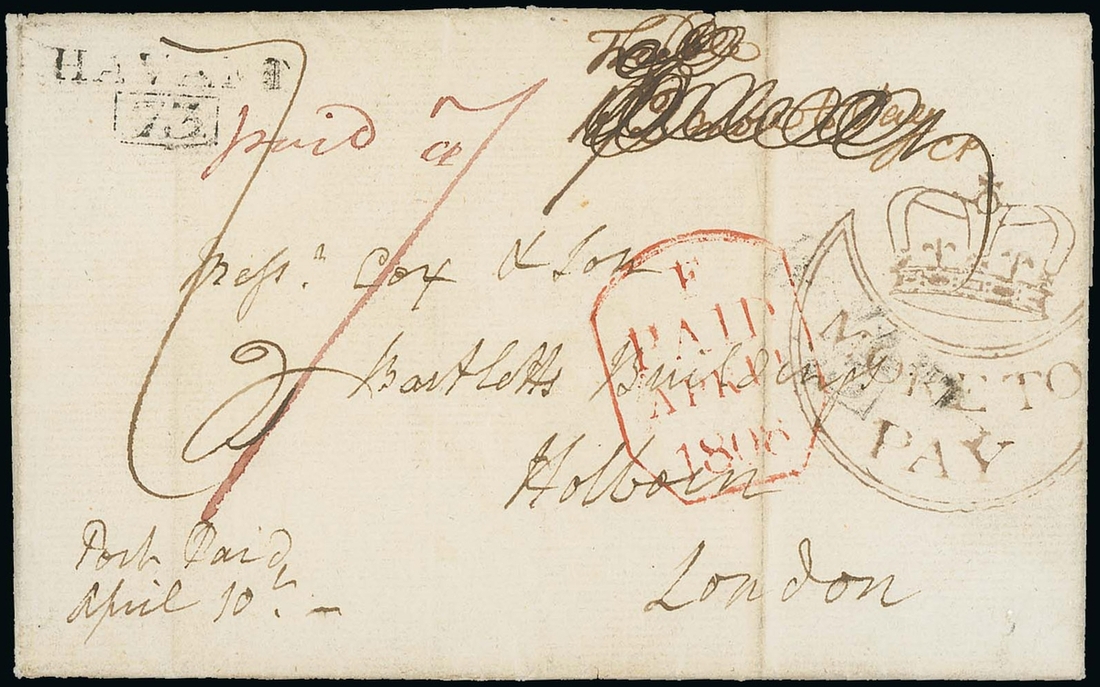 1808 (10 April) entire letter from Havant to "Messrs Cox & Son" in London, sent containing half bank notes for £200, noting "Enclosed you will find the second halves of Bank Notes for £200, which as the first halves have arrived you need not trouble yourselves to acknowledge", pre paid "7", endorsed "Treble/ ½ more to pay CP", deleted and eventually charged at a double rate latter, charged with a further 7d.; the face struck with "
