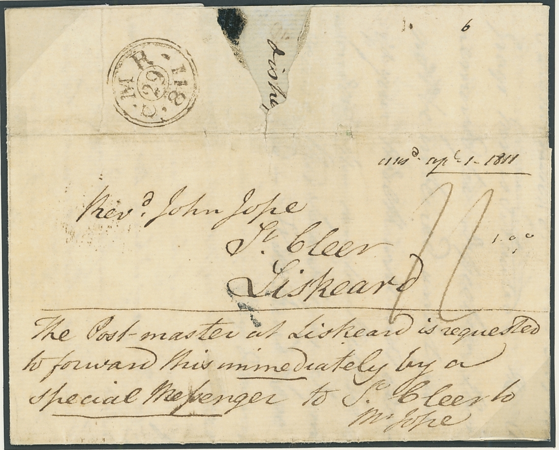 1811 (29 March) entire letter from London to Liskeard, rated "11", the lower half of the address panel with unusual endorsement "The Post-master at Liskeard is requested to forward this immediately by a Special Messenger to St. Cleer to Mr. Jope", the reverse with London despatch marking. Fine and unusual.