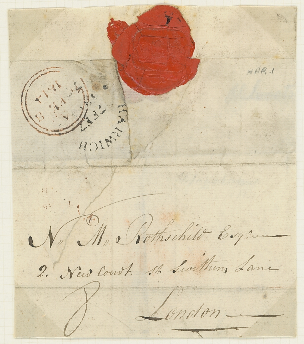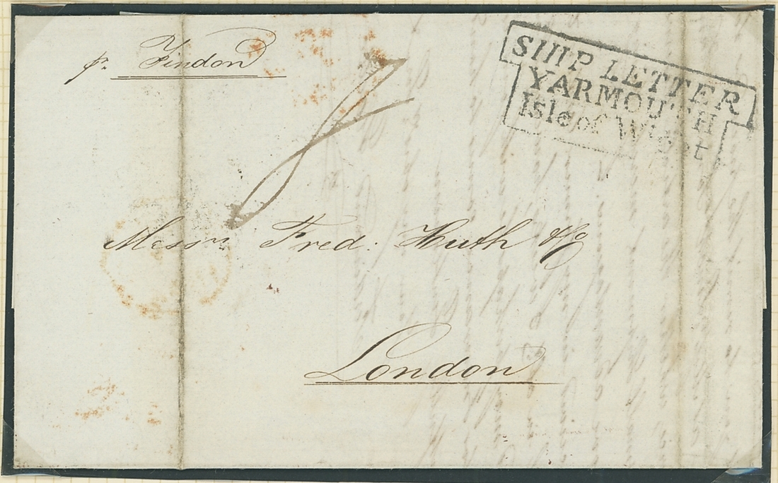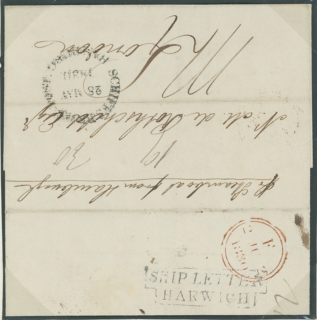 1814 (26 Jan.) part entire from Hellevoetsluis, Netherlands, to London with Harwich town d.s. likely used in lieu of Ship Letter, with memorandum note from Robertson in explanation; 1830 entire from Hamburgh to London with "