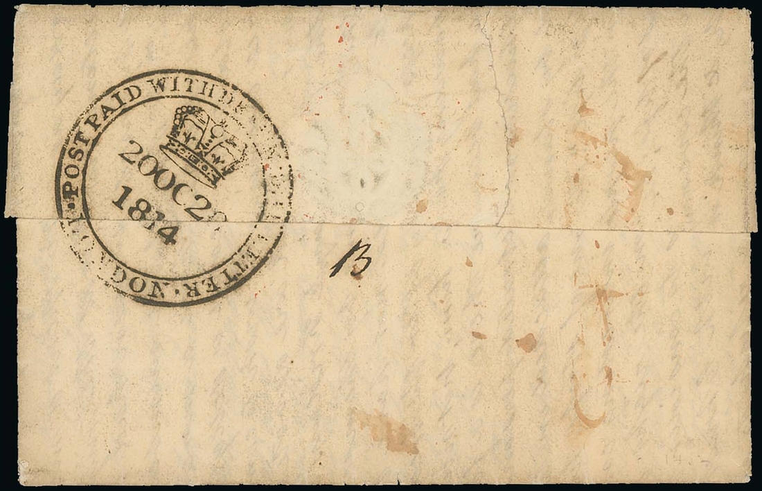 1814 (10 Oct.) entire letter from Lymington to "New England Coffee House, London", then on to New York, the face struck with London Paid 13.10.14 tombstone and manuscript rates "8d." (prepaid to London), then "8½d." to New York, the reverse struck with superb "