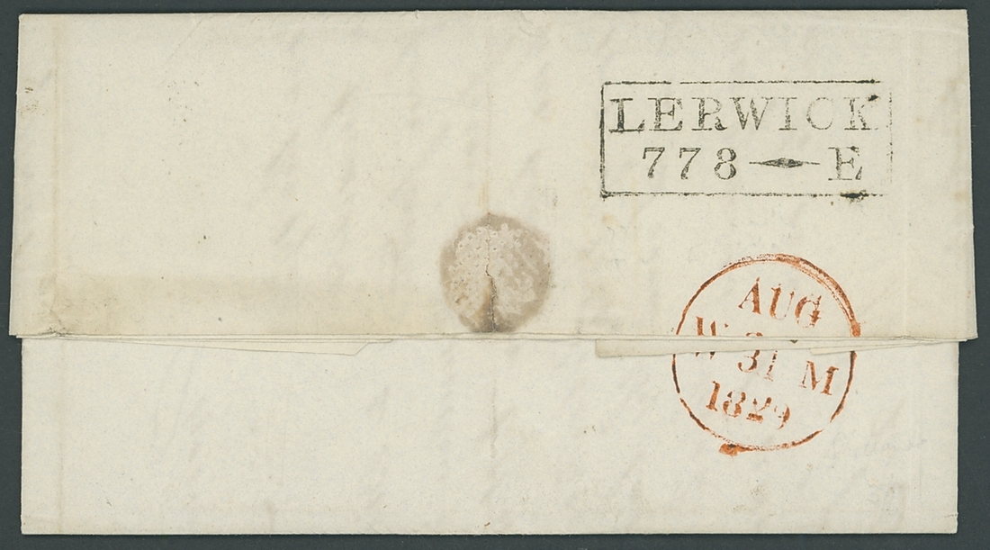 1829 (27 Aug.) entire letter from Shetland Bank, Lerwick to Edinburgh, rated "6", the reverse with superb boxed "