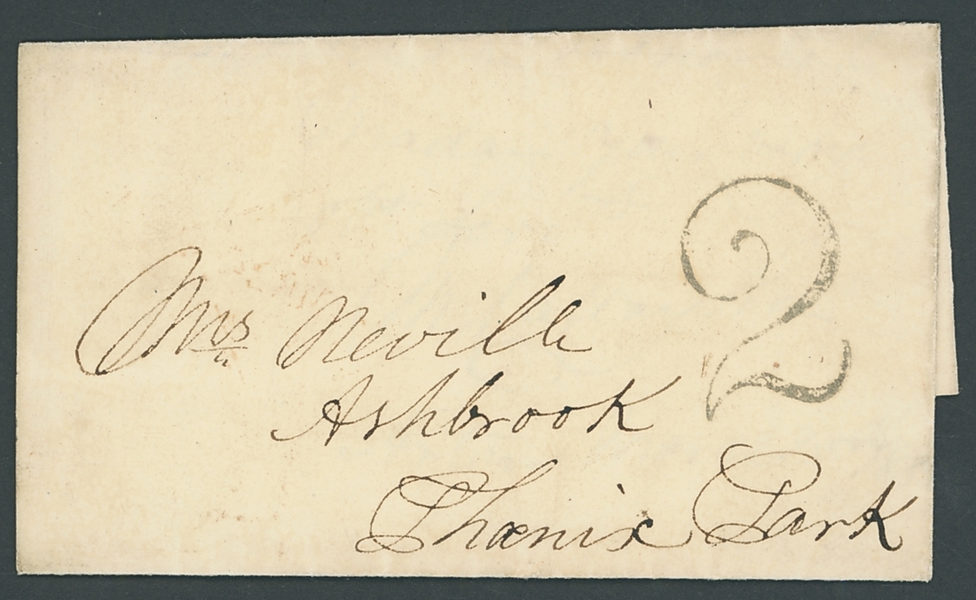 1835 (24 March), entire letter from Artane to Phoenix Park with very fine "2" handstamp denoting unpaid as both places were outside the Penny Post area; clean and uncreased. Rare