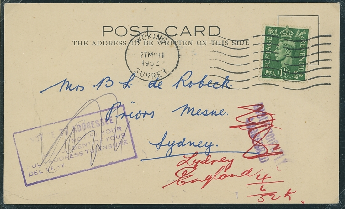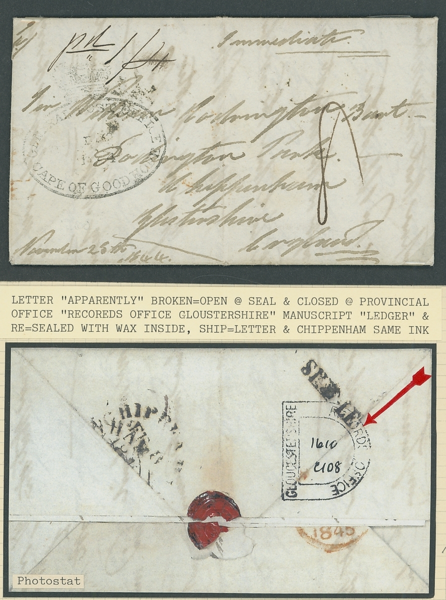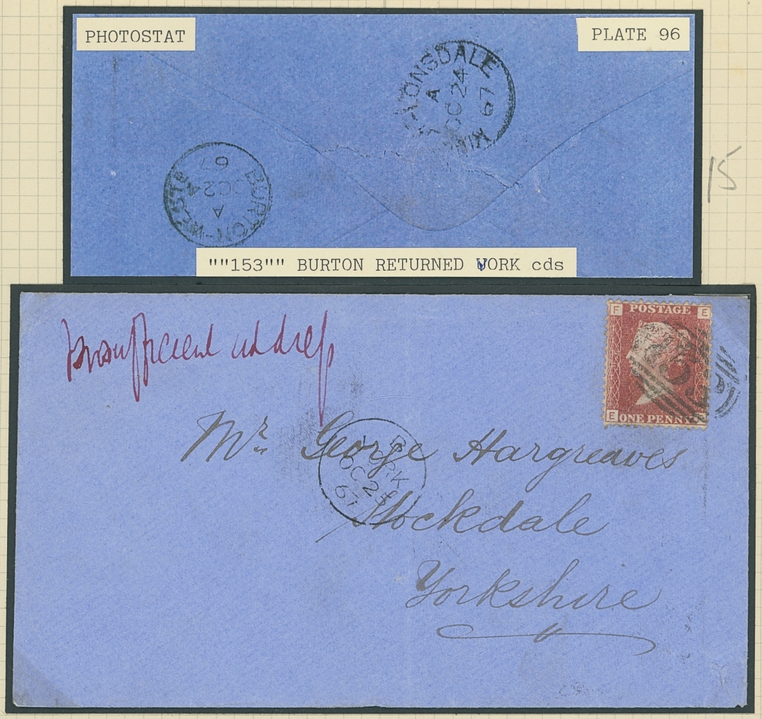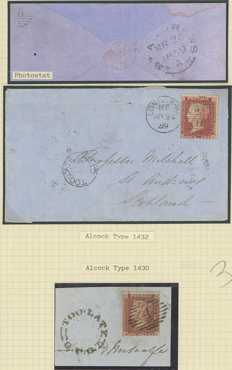 1840-1952 "instructional marks" collection on pages, comprising covers (20+) to a range of destinations with various different marks including "Too Late", "More to Pay" cachets, "Late Fee" and "Missent" marks; examples include 1846 part entire bearing 1841 1d. red to Currie Scotland with scroll type "Too Late" cachet, 1907 envelope bearing 1½d. to Southport with boxed "Late Fee Paid" h.s.; also 1840 Mulready A141 and A173 1d. envelope unsevered pair, unused, 1857-80 3d. used on "The Illustrated London News" addressed to South Wales, the special Silver Jubilee edition on Silver paper (complete, folded), franked 1935 1½d. and addressed to Alberta and a selection of 24 Air Letters some overprinted Specimen or cancelled. Mixed condition though an interesting lot.