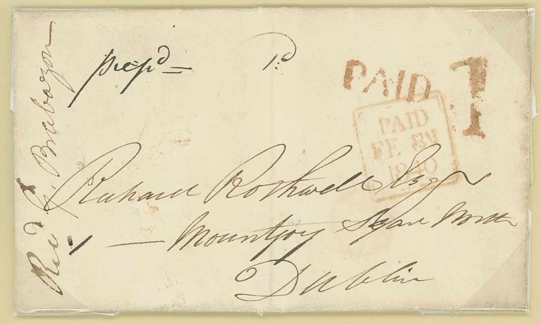 1840 (6 Feb.), entire letter from Slane to Dublin, endorsed Prepd = 1d. with "