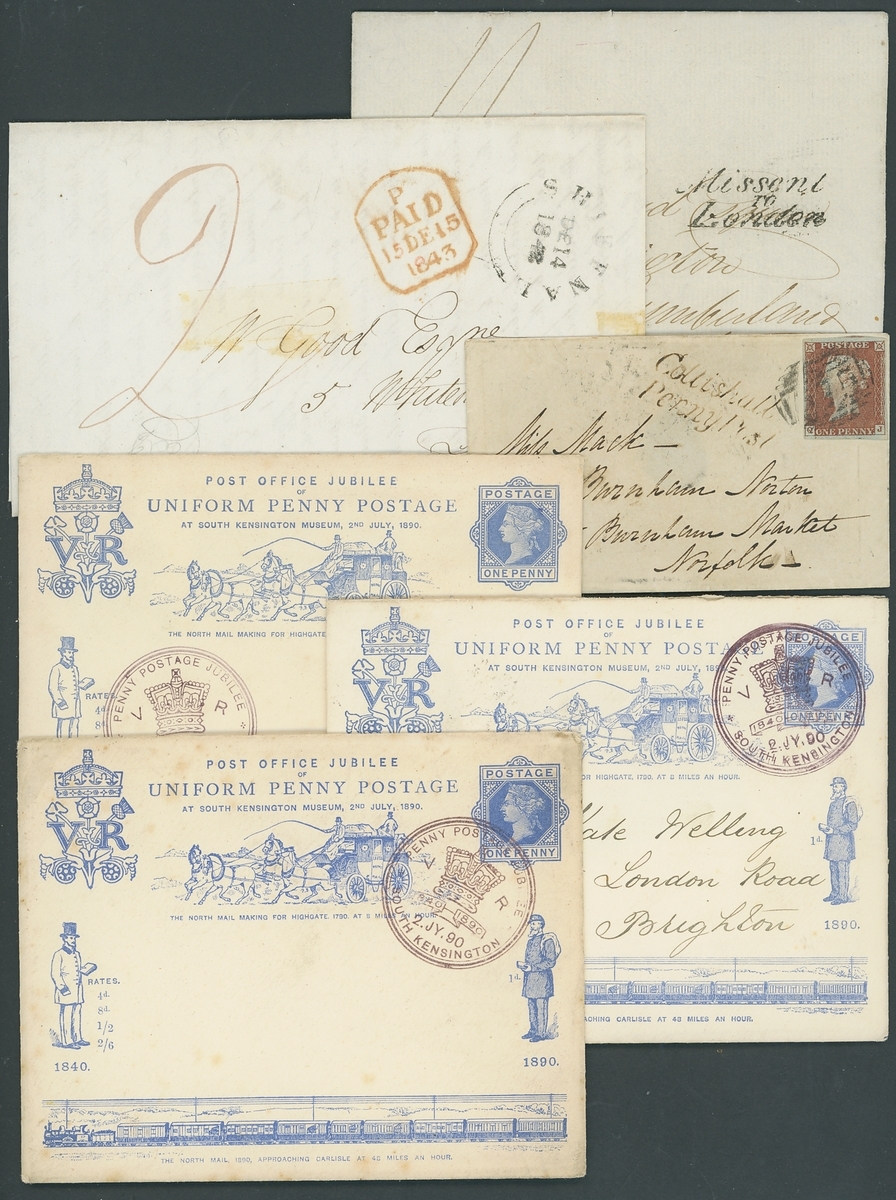 1841-90 selection of six entires or envelopes, comprising 1841 with Missent/to London, 1843 with red Dawley Green/Penny Post (scarce), 1844 small envelope franked 1d. with Coltishall/Penny Post, 1890 three Post Office Jubilee 1d. envelopes with enclosures; good to fine