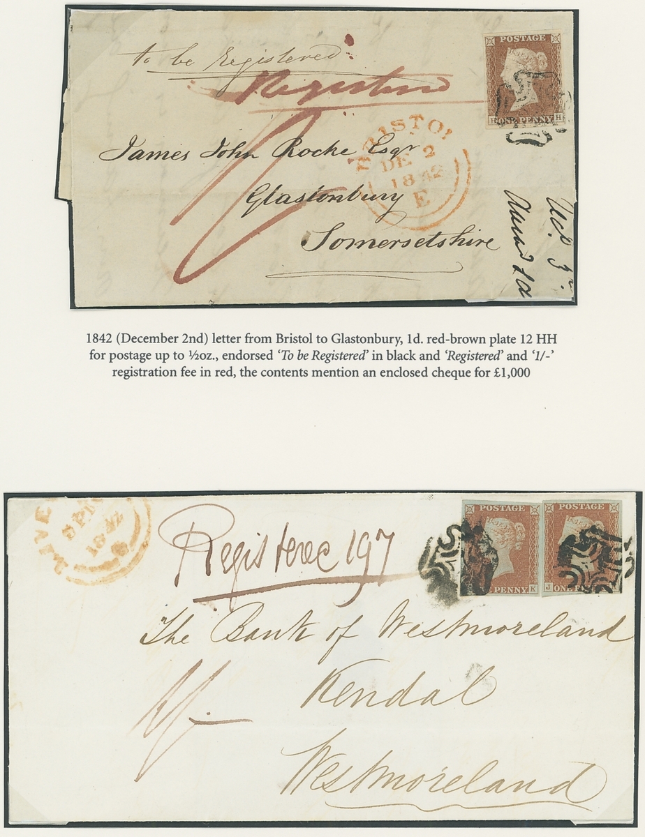 1842 ( 16 Sept.) entire registered from Liverpool to Kendal bearing 1841-53 1d. singles (2), both with large margins all round, tied by black Maltese Crosses, endorsed "Registered 197" and manuscript charge "1/-" registration fee, Liverpool d.s. on face and Kendal on reverse; also 1842 (2 Dec.) entire letter registered from Bristol to Glastonbury bearing 1841-53 1d. red, clear margins all round, tied by black Maltese Cross, endorsed "to be Registered" and "Registered", charged "1/-" registration fee, the front with Bristol d.s. A scarce duo.