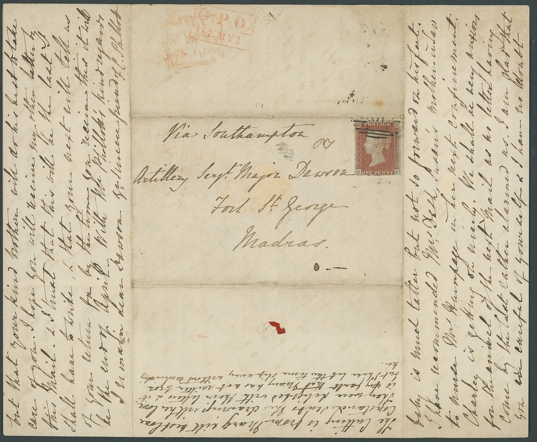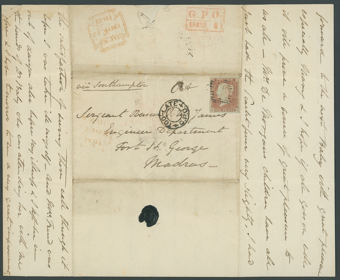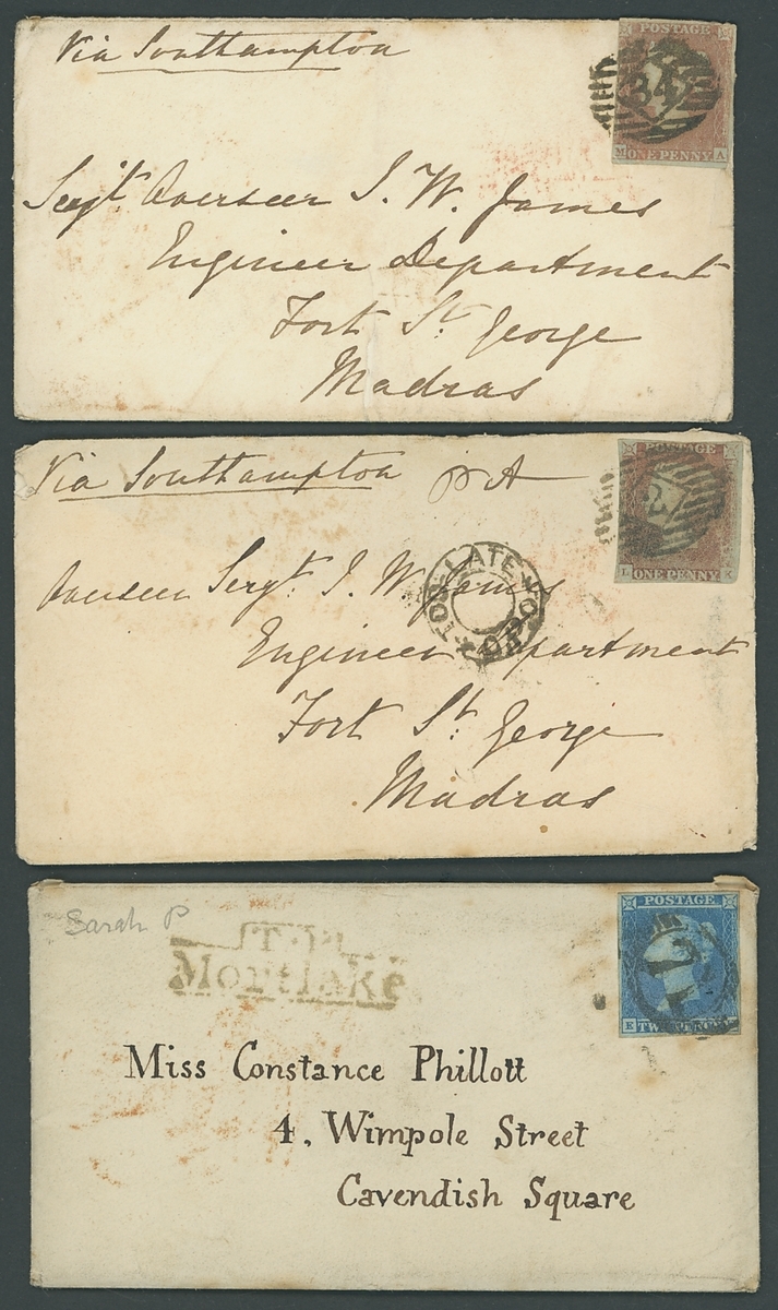 1847-49 a series of four covers From Arthur Phillott (Physician and Apothecary, 1813-53) addressed to Madras including three covers to Sergeant Overseer J.W. James (one entire letter, two envelopes), and one entire letter to Artillery Sergeant Major Dawson; each bearing 1841-53 1d. red-brown paying a lower concessionary rate to soldiers. Also 1847 envelope and letter from Sarah Phillott in Mortlake to Constance Phillott Cavendish Square bearing 1841 2d. blue. An interesting group