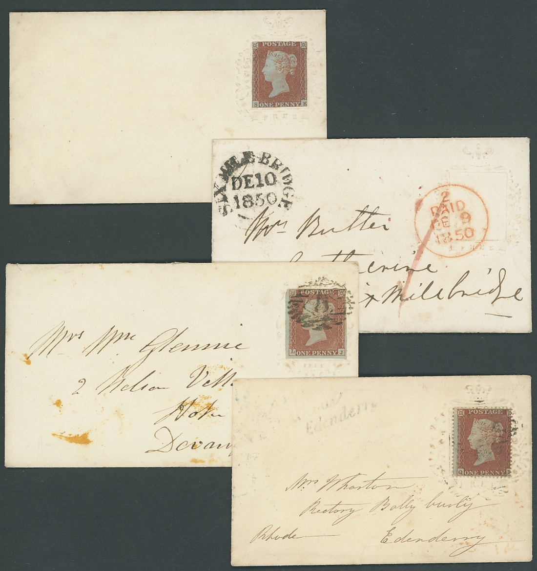1850-54, four embossed Ladies envelopes with embossed rectangle, surrounded by ornate leaves and "