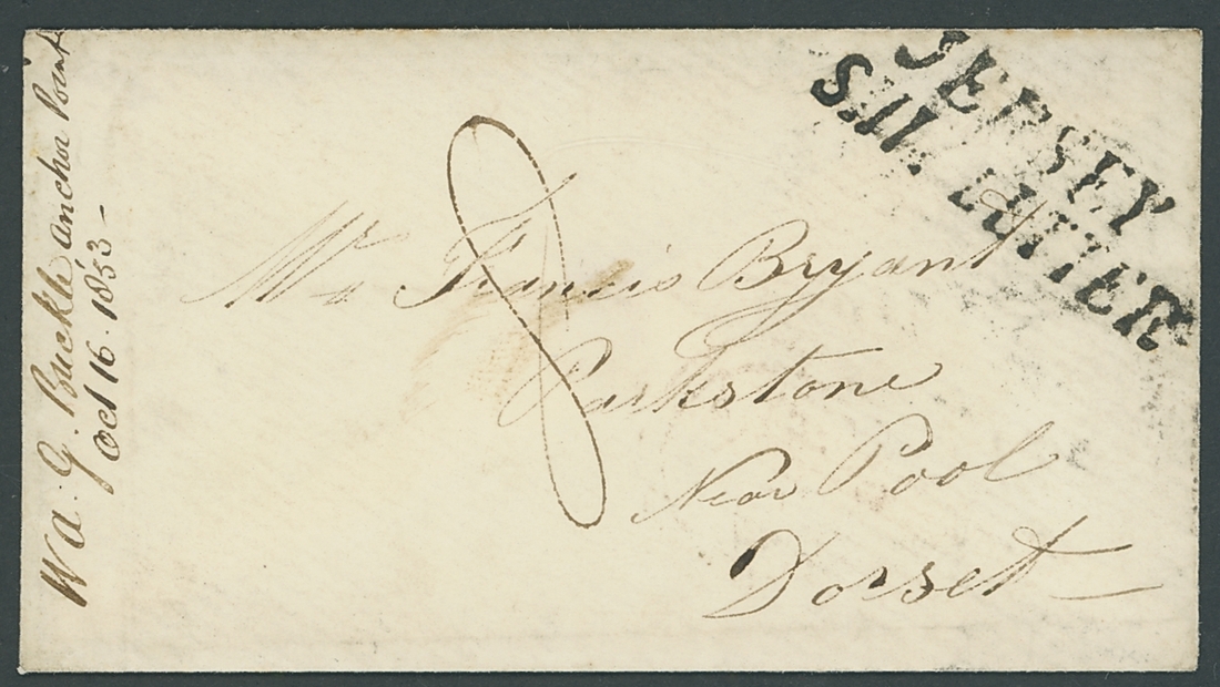 1853 (19 Nov.), small stampless envelope to Dorset with "JERSEY/SHIP LETTER" handstamp, rated 8 in manuscript and dated markings on the reverse; fine and uncreased