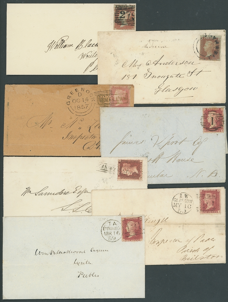 1854-59, seven entires/envelopes franked 1d. "Stars", including 1854 with blue framed