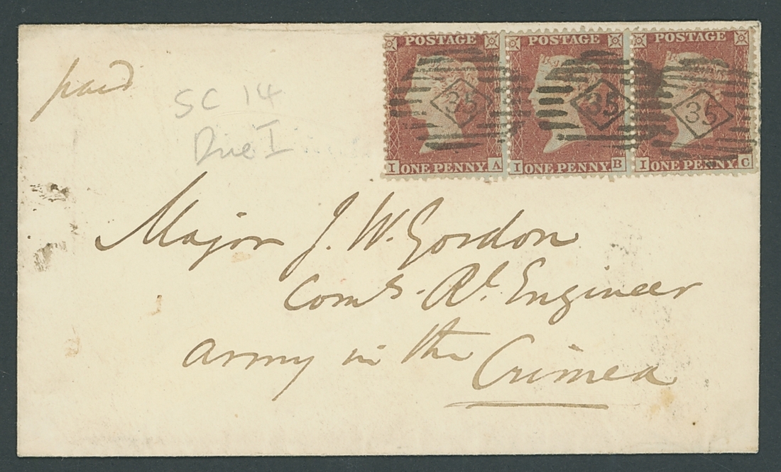 1855 (29 Jan.) envelope addressed to 'Major' (later General) J.W.Gordon/Coms RI Engineer/Army in the Crimea bearing 1d. strip of three cancelled by London '35' barred obliterator, the reverse with Woolwich E.C. straight-line in blue and despatch datestamp. Fine and attractive Crimea destination.
