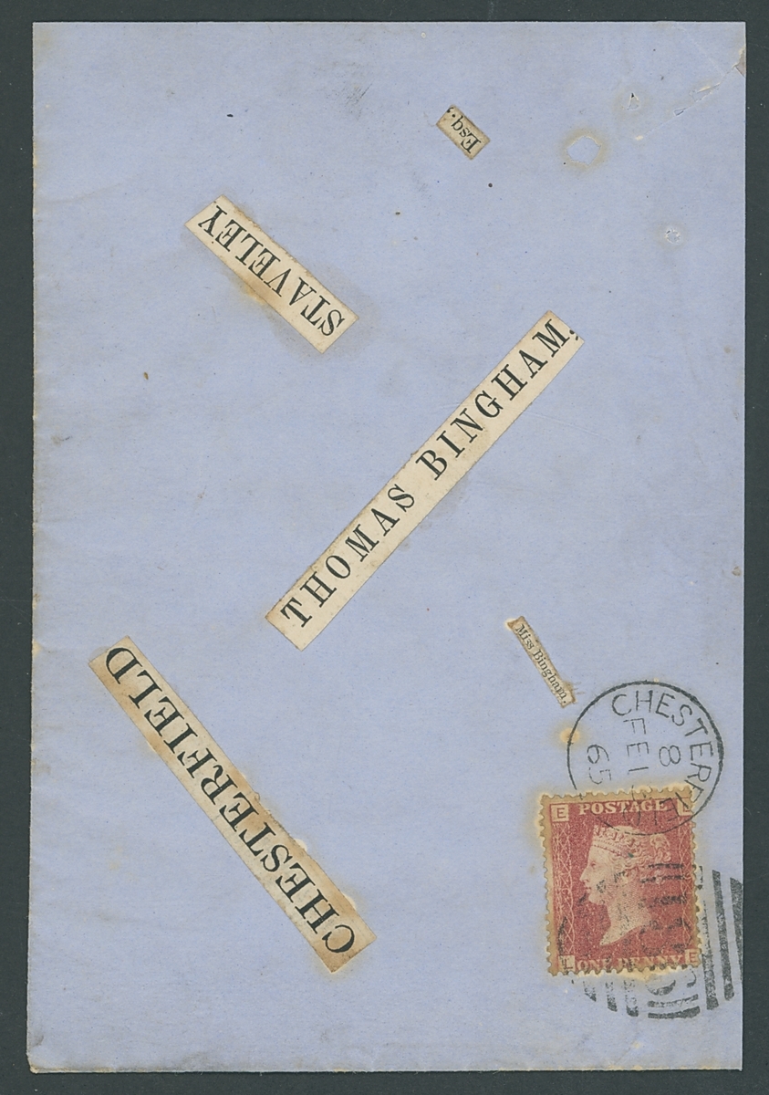 1865 (13 Feb.), blue envelope to Chesterfield with the addressees name and address made from cut outs from a newspaper or magazine; franked 1864-79 1d. Plate 94 (discoloured around the perfs.); small faults and stains. Most unusual, probably a Valentine