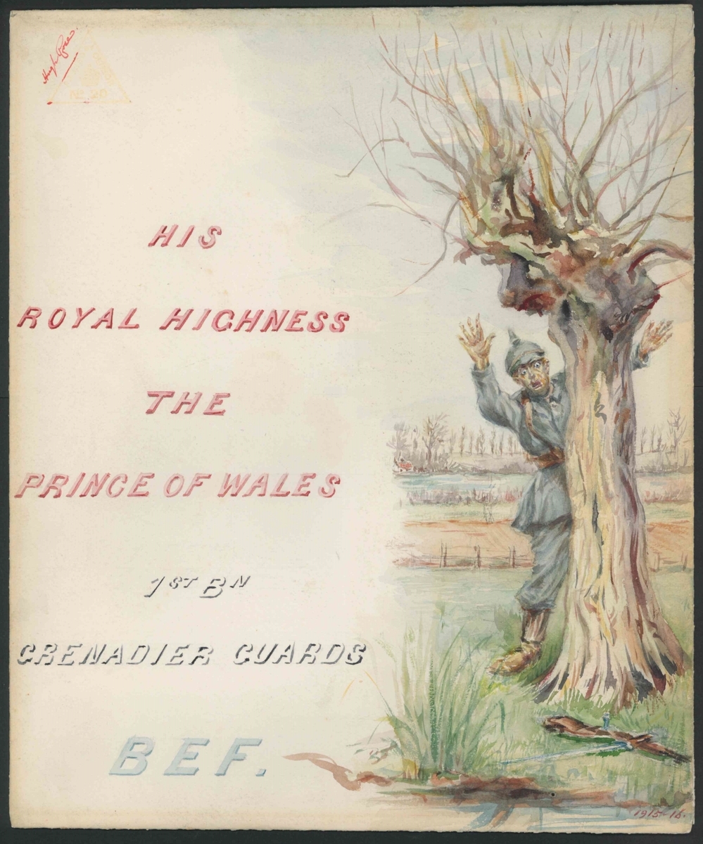 1915-16 large hand painted card envelope (c.281x340mm.) from Col. Hugh Rose to "His Royal Highness The Prince of Wales 1st Bn Grenadier Guards BEF"; the images depicts a German soldier in surrender, concealed behind a tree. The envelope with triangular Censor marking and signed by the artist in the upper left. Very fine and rare.