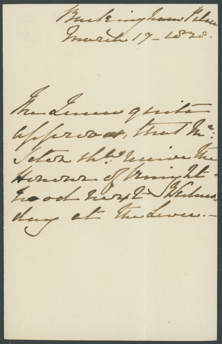 1838 (17 March), a letter, with embossed "(Crown)/VRI", written by Queen Victoria at Buckingham Palace, The Queen quite approves that Mr. Seton shd receive the honour of knighthood next Wednesday at the Levee. A fine early letter from Victoria just eight months into her long reign