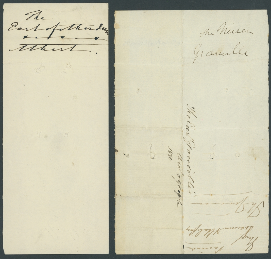 1860 (c.) Dispatch tag signed The Earl of Aberdeen Albert (Prince Albert), on reverse The Queen Clarendon (Foreign secretary), also 1880 tag with Private The Viscount Halifax, The Queen, also notated The Queen Granville; both with string holes. Most unusual