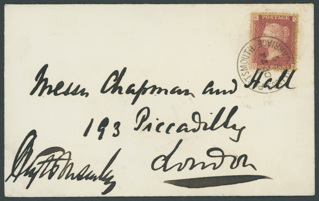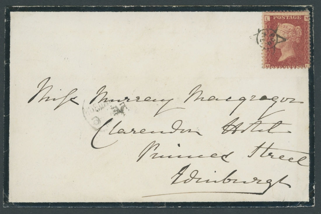 1872 (Feb.) mourning envelope with embossed "Osborne"on the flap, addressed to Miss Murray Macgregor (authoress and friend of Queen Victoria) in Edinburgh, franked 1d. Plate 127 tied by the tiny Por/SC Star of the Plymouth T.P.O., transit and arrival datestamps on reverse; Also 1875 (24 Dec.), envelope from Osborne House to London with superb intact black wax Privy Purse seal on reverse, signed Henry Ponsonby (Private secretary to Queen Victoria), franked 1d. Plate 148 with Portsmouth Sorting Carriage c.d.s. and with arrival of Dec. 25 on reverse. A fine duo
