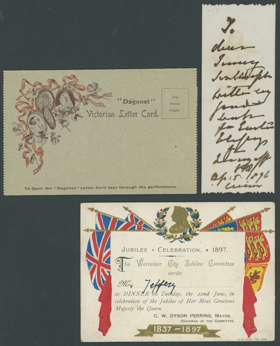 1896, a small French multicoloured Easter Card "Le Christ et Saint Jean", written by Queen Victoria, inscribed on the reverse To dear Ismay Southampton with every good wish for Easter blessings from her vy afft VR 1 Ap 1896; fine and a very scarce personal card from the latter part of Victoria's life, offered together with 1897 "Dagonet" Victorian lettercard and embossed Diamond Jubilee invitation card. A charming trio.