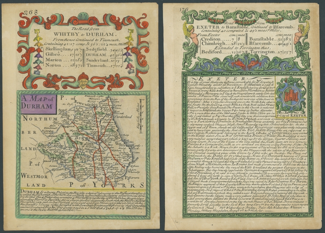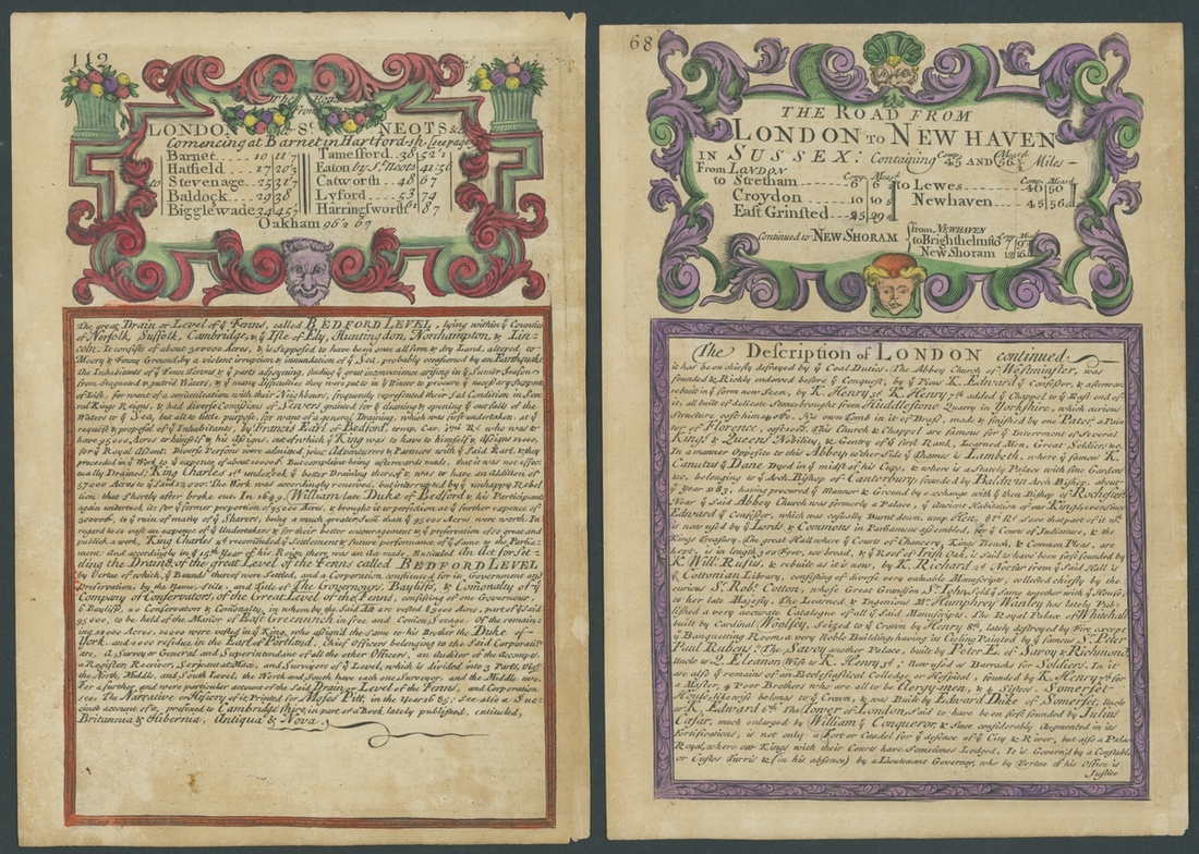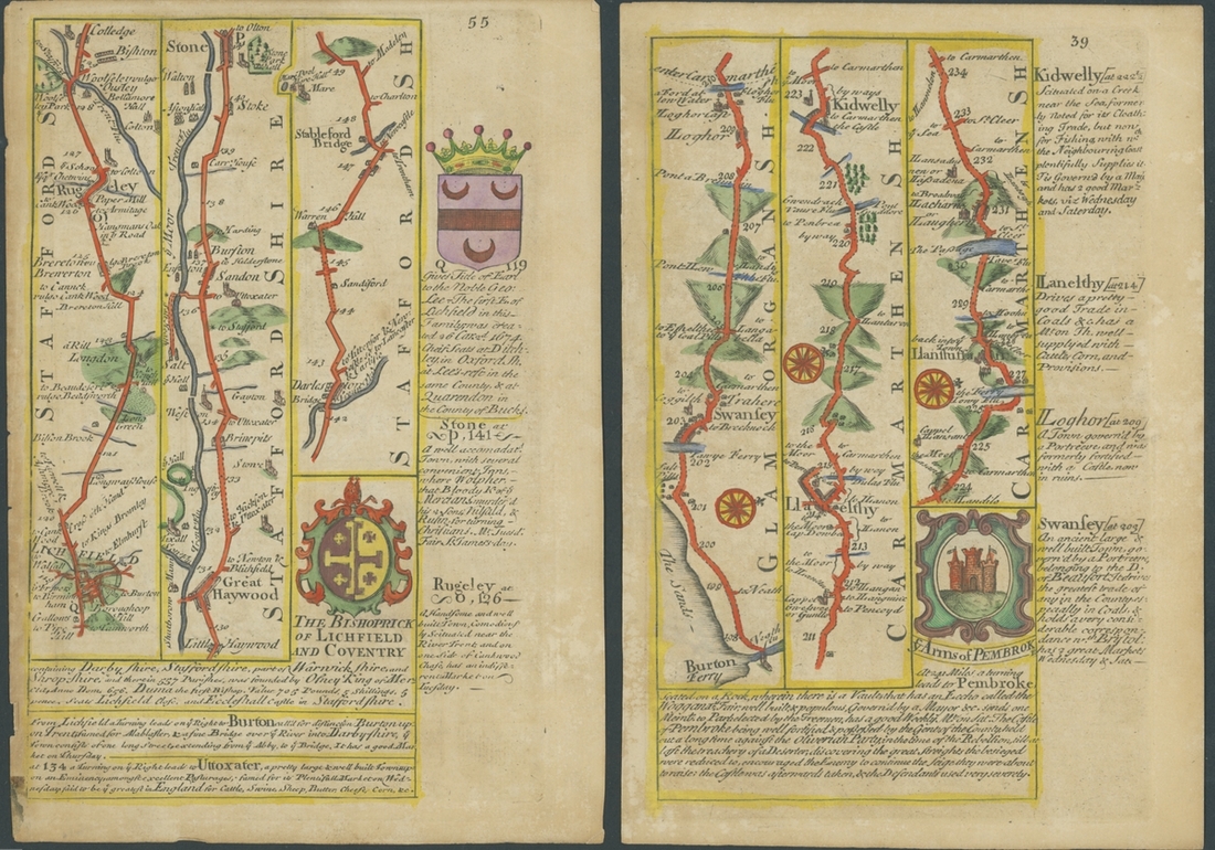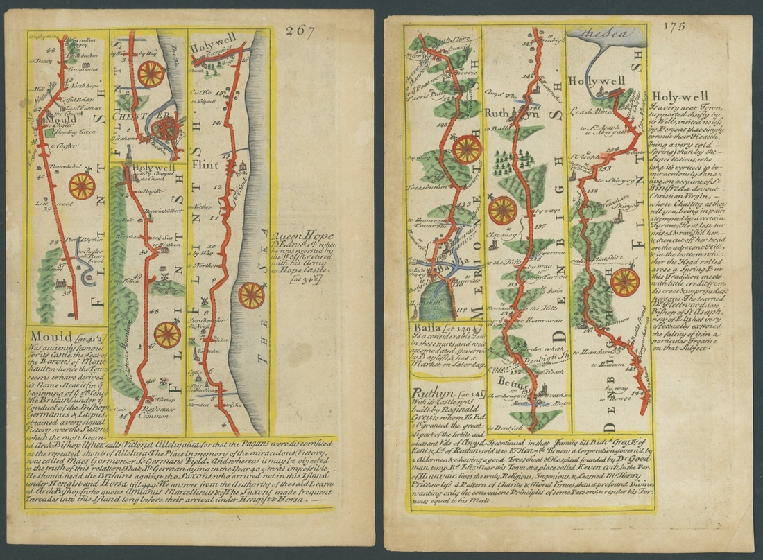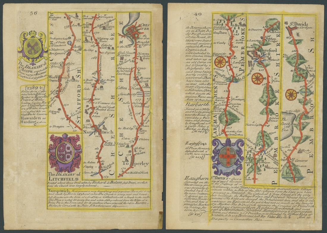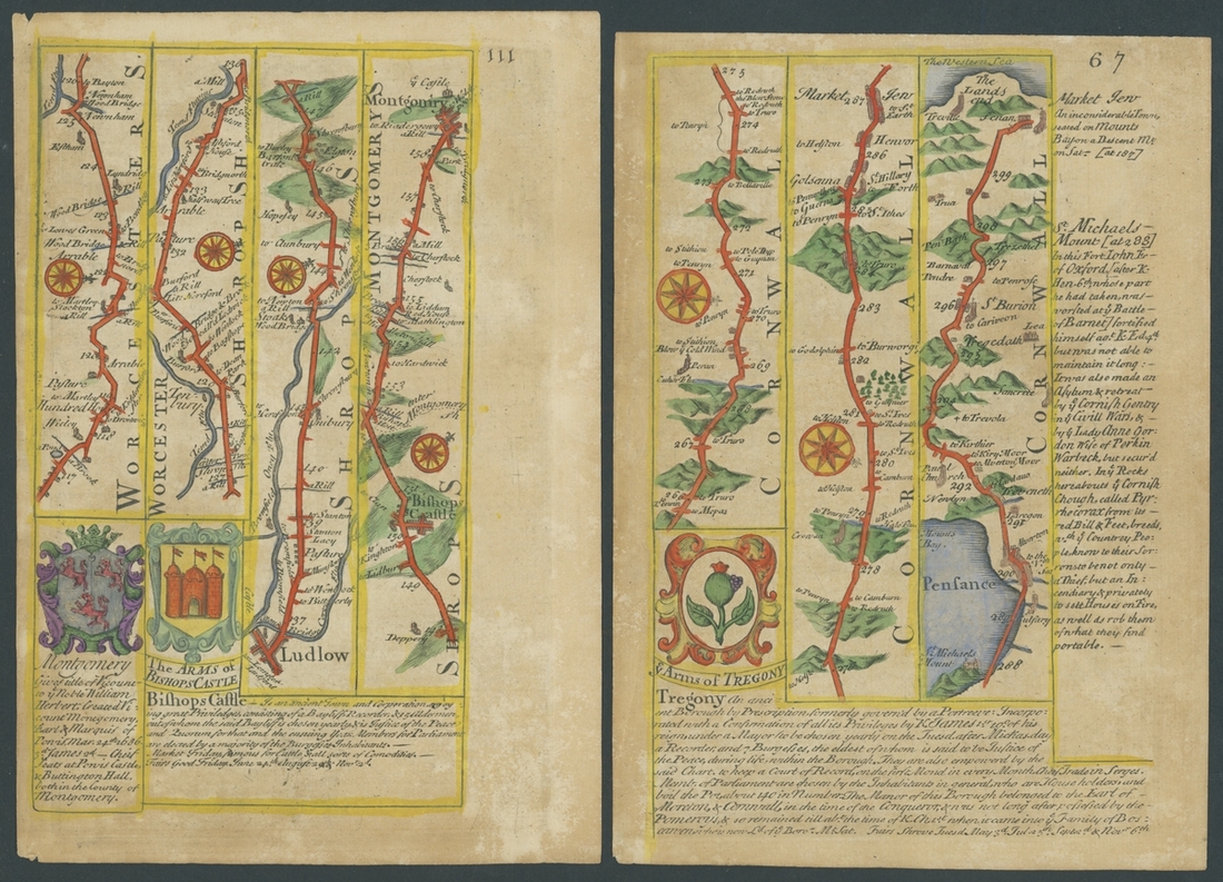 1753, six coloured leaves [39/40, 55/56, 67/68, 111/112, 175/176, 267/268] from the Owen and Bowen Strip Map publication, each leaf printed on both sides, areas include Wales with Holywell and Flintshire, Staffordshire, Cornwall, and Worcestershire. Some foxing commensurate with age otherwise fine and charming.