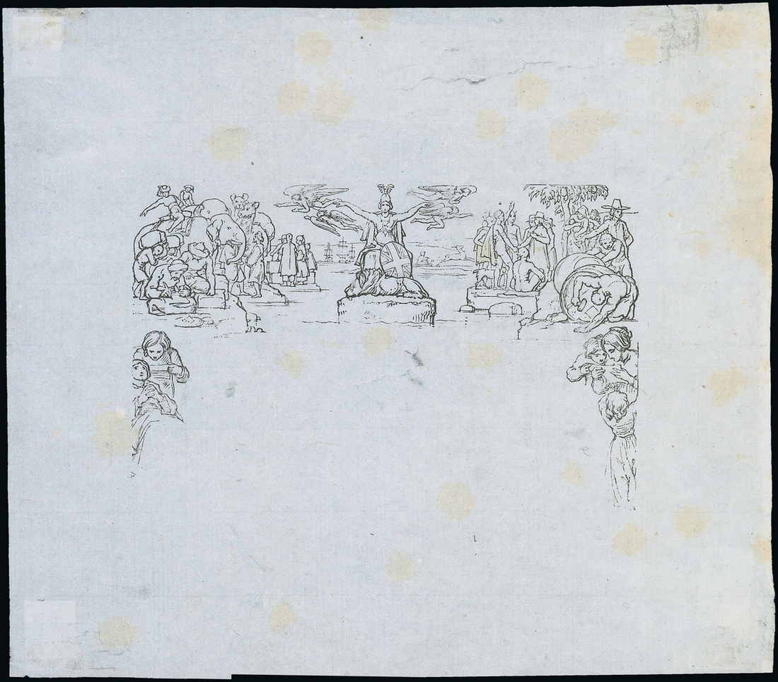 John Thompson's proof of stereotype in black on India paper in lettersheet format (c.199x174mm.) with near complete design less the framelines and inscriptions "W. MURLEADY" and "JOHN THOMPSON" which would be added in subsequent proofs and the issued design; one or two tears as to be expected with this delicate paper and some light foxing, otherwise fine and a most important piece for the Mulready and Great Britain collector, believed to be unique. B.P.A. Certificate (2010). Spec. MP3, £25,000