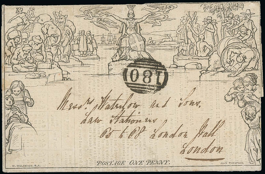 A2, dated 8 March 1850, with blue English and Scottish Law fire and Life Assurance advertisement (Specialised MA122b), addressed to London and with inverted "180" barred oval cancellation clear of Britannia, Chester and London datestamps on the reverse; some peripheral imperfections but wonderful fresh appearance and rare. B.P.A. Certificate (2006)
