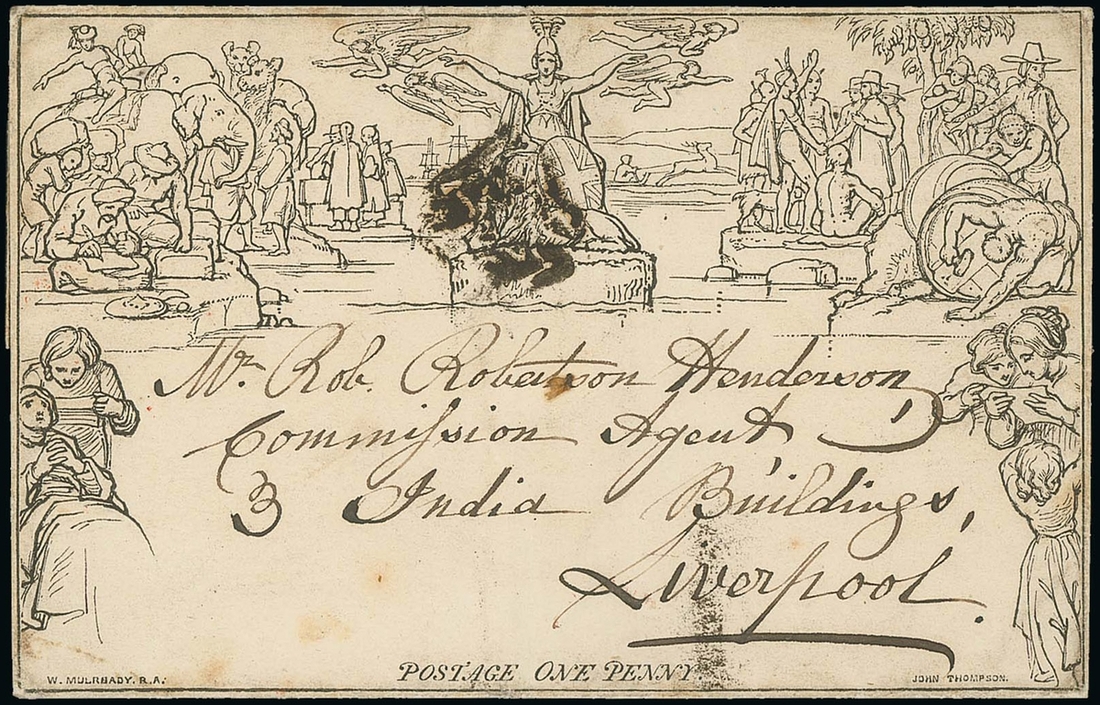 A5, 1843 (Feb.) from Lerwick to Liverpool, cancelled by black Maltese Cross, the revere with boxed Lewrick, Edinburgh and Liverpool d.s., some overall foxing otherwise fine and rare, there being few Mulready lettersheets known used from the Shetlands