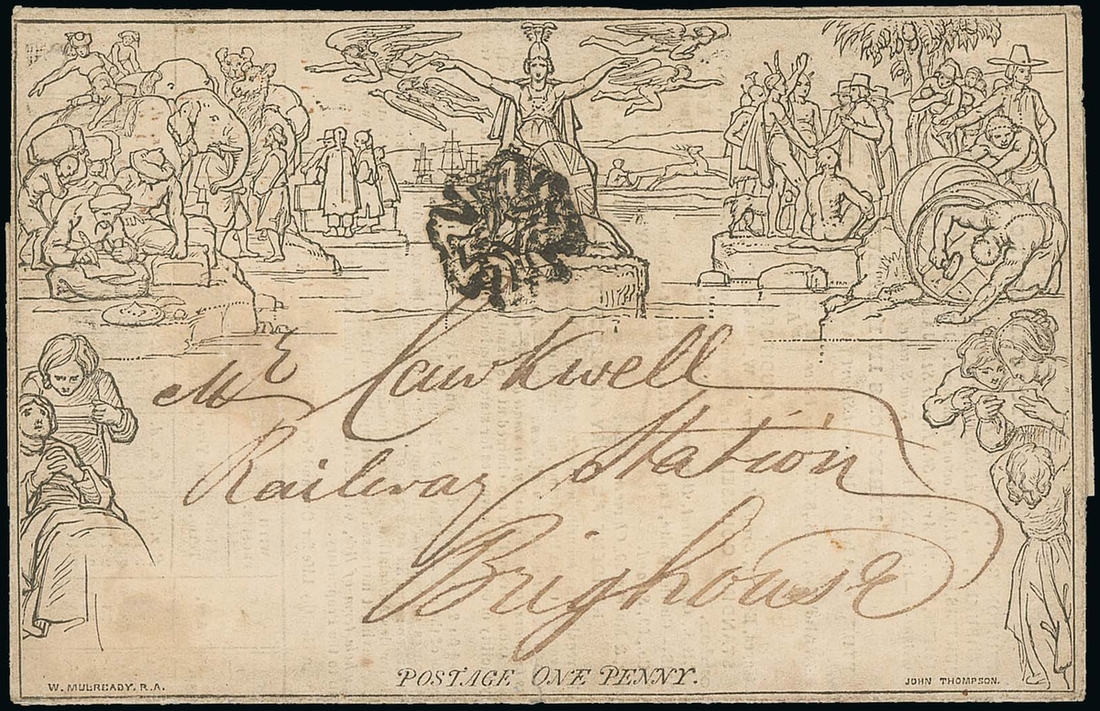 A27, with blue English and Scottish law fire and life assurance advertisement (Specialised MA 122b), dated 24 April 1841 and addressed to Railway Station Brighouse, fine black Manchester "Fish Tail" distinctive Maltese Cross cancellation and with matching c.d.s. on the reverse; some soiling but very scarce with only seven examples of the distinctive Cross on a Mulready recorded by Rockoff and Jackson