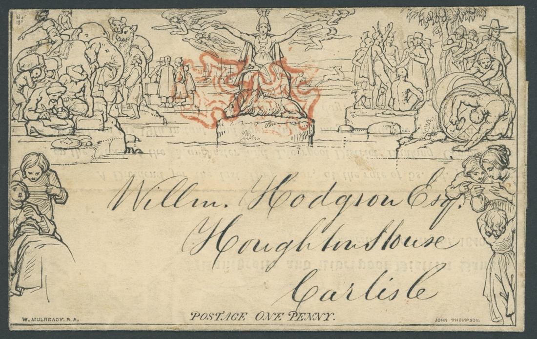 A63, with Manchester and Liverpool district bank advertisement (Specialised MA307), dated 18 Aug. 1840 and addressed to Carlisle, two red Maltese Cross cancellations and Manchester c.d.s. across flap on the reverse; horizontal filing fold, slight soiling and some surface scrapes on the reverse. Scarce