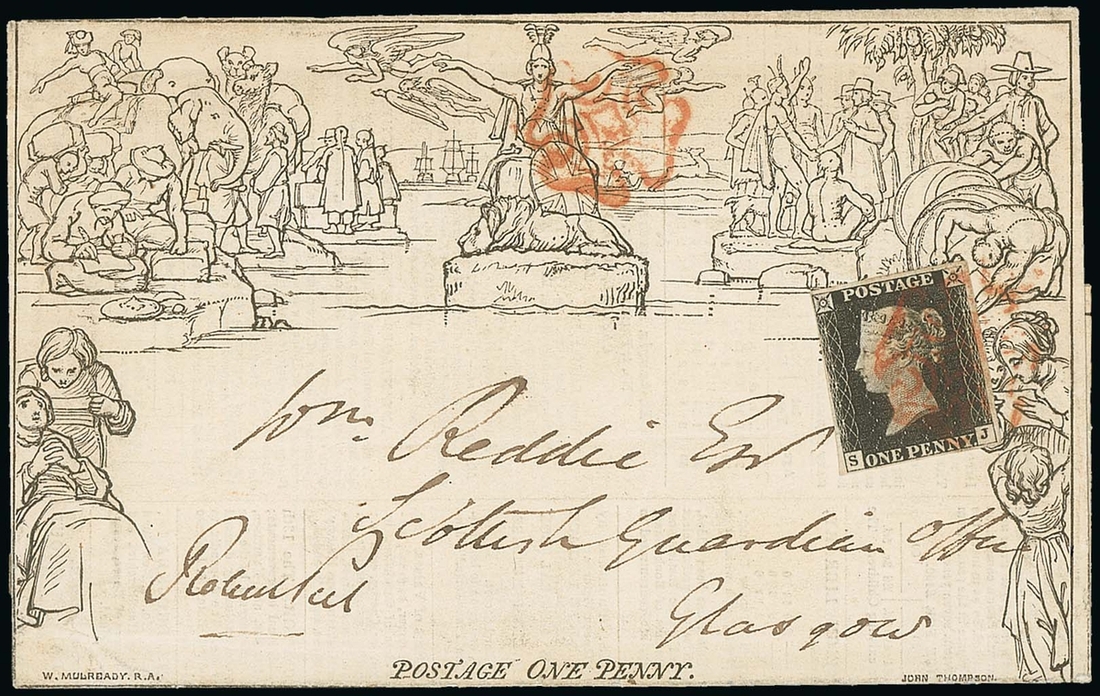 A71: "The Envelope Select Advertiser" printed in blue, 1840 (2 July) to Glasgow uprated with 1d. black, Plate 4, lettered SJ, tied by red Maltese Cross, written in the hand of and signed by Sir Robert Peel; a fine and rare uprated Mulready. B.P.A. Certificate (1972). S.G. MP1a