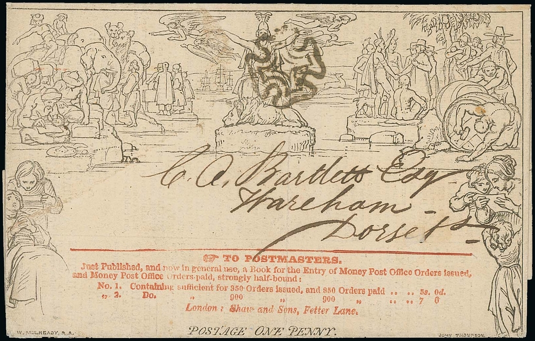 A237, with Works published by Shaw & Sons and "Poor Laws" at left advertisement (Specialised MA 477g) and with additional red "(Pointing Finger) To Postmasters, just published, and now in general use, a book for the Entry of money Post Office orders issued, and Money Post Office orders paid; strongly half bound...." advertisement on the front, dated 8 July 1841 and used to Wareham, black Maltese Cross cancellation, dated markings on reverse; clean filing folds. Fine and rare. Believed to be one of only two recorded examples of the very rare advertisement (the other known example, seemingly addressed in the same hand is ex Klempka and Grunin, Spink Dec. 7 2022). Photo