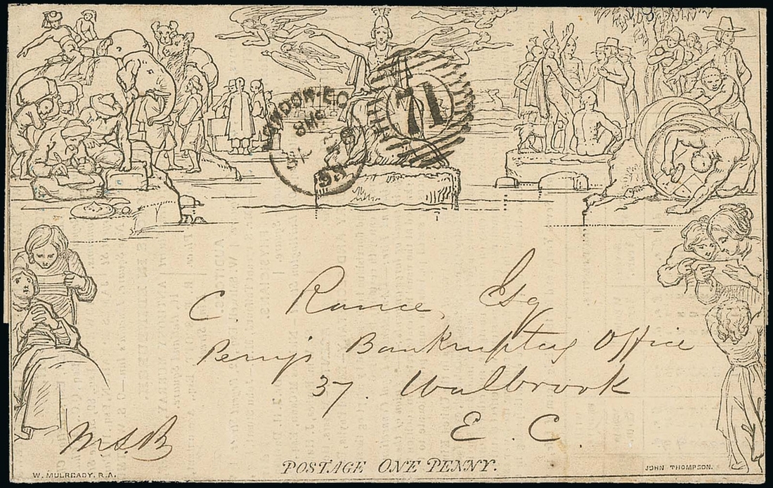 Stereo missing, dated 26 Sept. 1858, with blue English and Scottish law fire and life assurance advertisement (Specialised MA 122b), superb central London "71" duplex cancellation and with equally fine blue Kennington Cross u.d.c. on the reverse; flap thinning, otherwise fine and uncreased