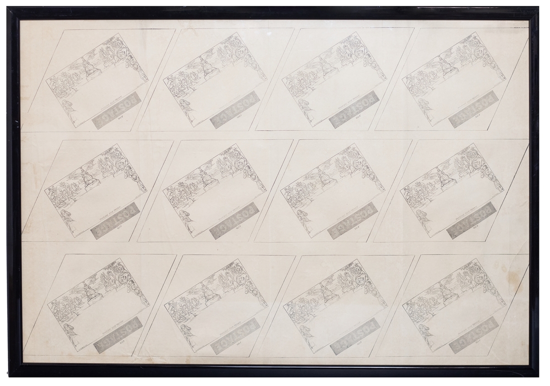 A complete sheet of twelve arranged (4x3) with stereos A164, A172, A174-A182 and A189, small area of foxing and three or four vertical folds as one might expect which in no way detract from the visual appeal of this rare sheet. Framed (800x560mm.)
