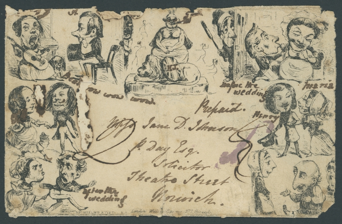William Spooner envelope number 1, dated 22 Aug. 1840 and used from London  to Norwich, endorsed "Prepaid", rated "1" (crossed through) and "2" in manuscript, dated markings on reverse; the envelope, with a variety of humorous notations on the front, roughly opened, ink burning and the right hand flap missing. Nevertheless rare.
