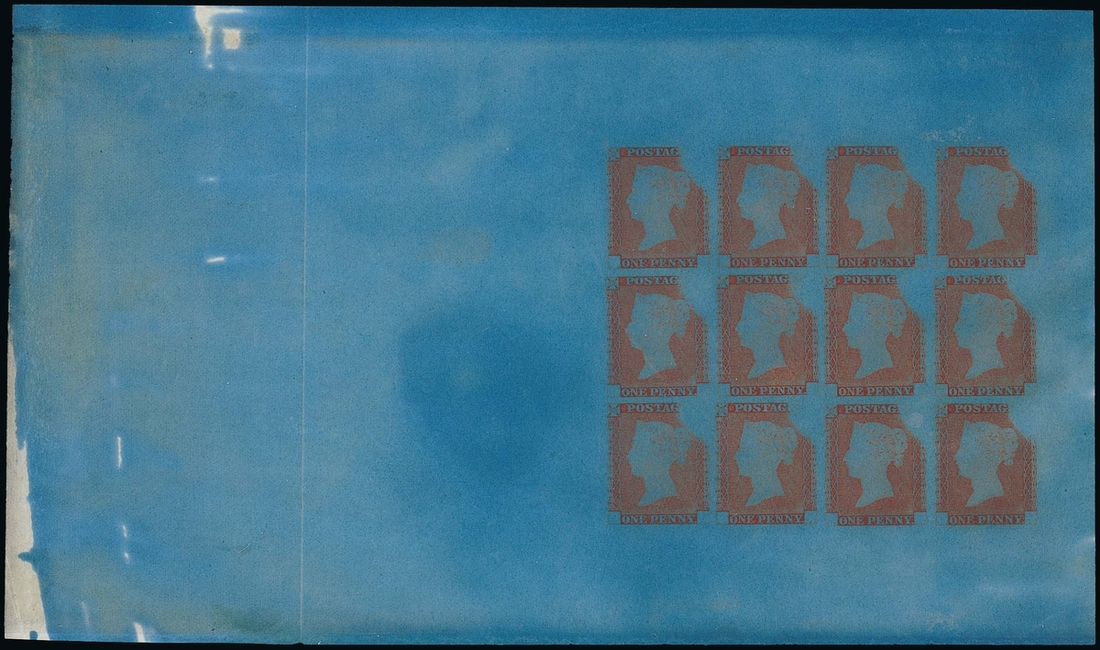 State 3: Complete sheet of twelve (4x3) in pale red-brown on thin white wove, unwatermarked paper which has been brushed with Prussiate of Potash, large sheet margin at left with had vertical fold well clear of the impressions; fine and rare. Spec.  SP20c(a)