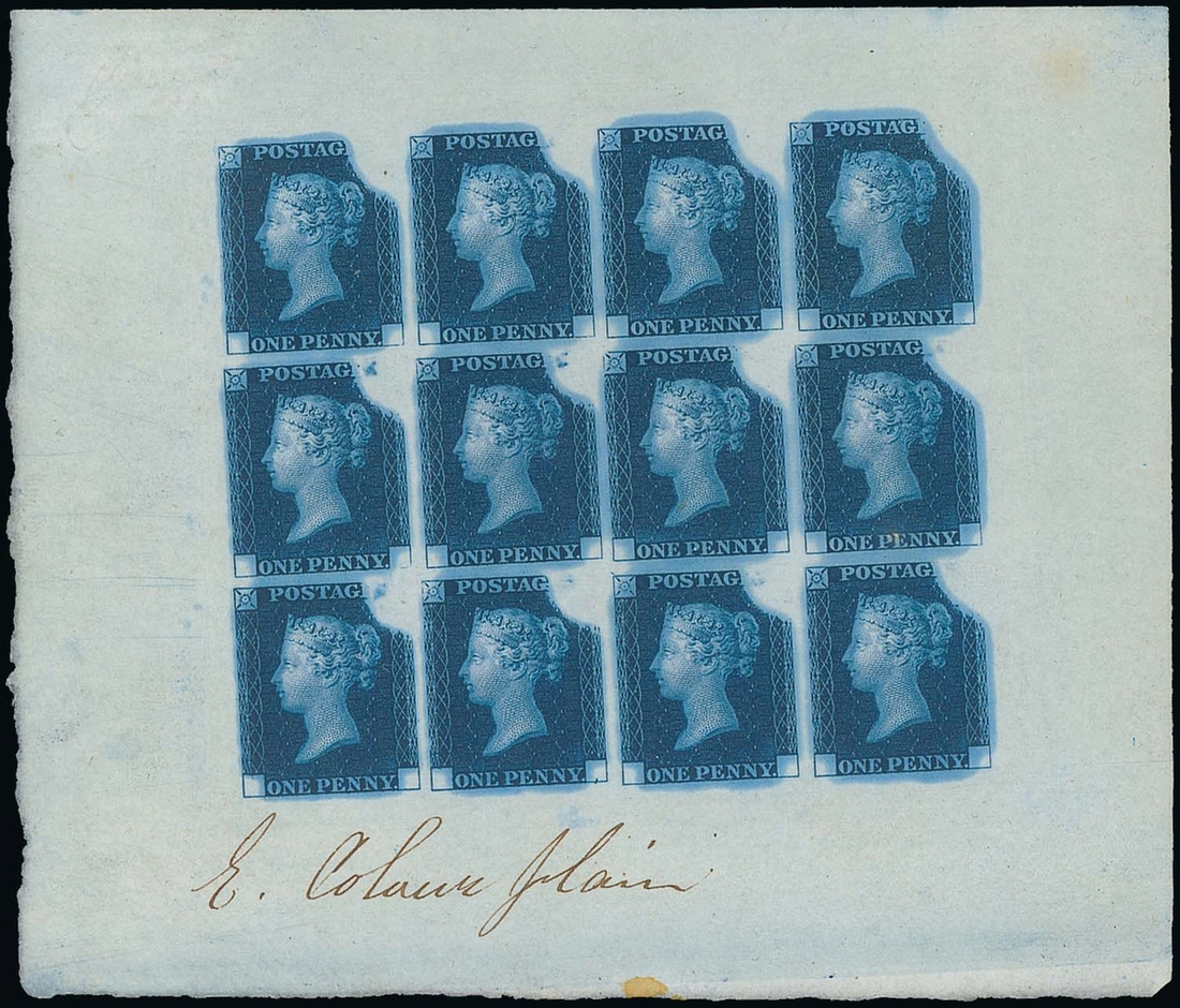 State 2/3: Complete sheet of twelve (4x3) in deep blue on thin wove paper, inscribed at foot by Edwin Hill "E. Colour plain",  fine and a rare piece of remarkable colour.