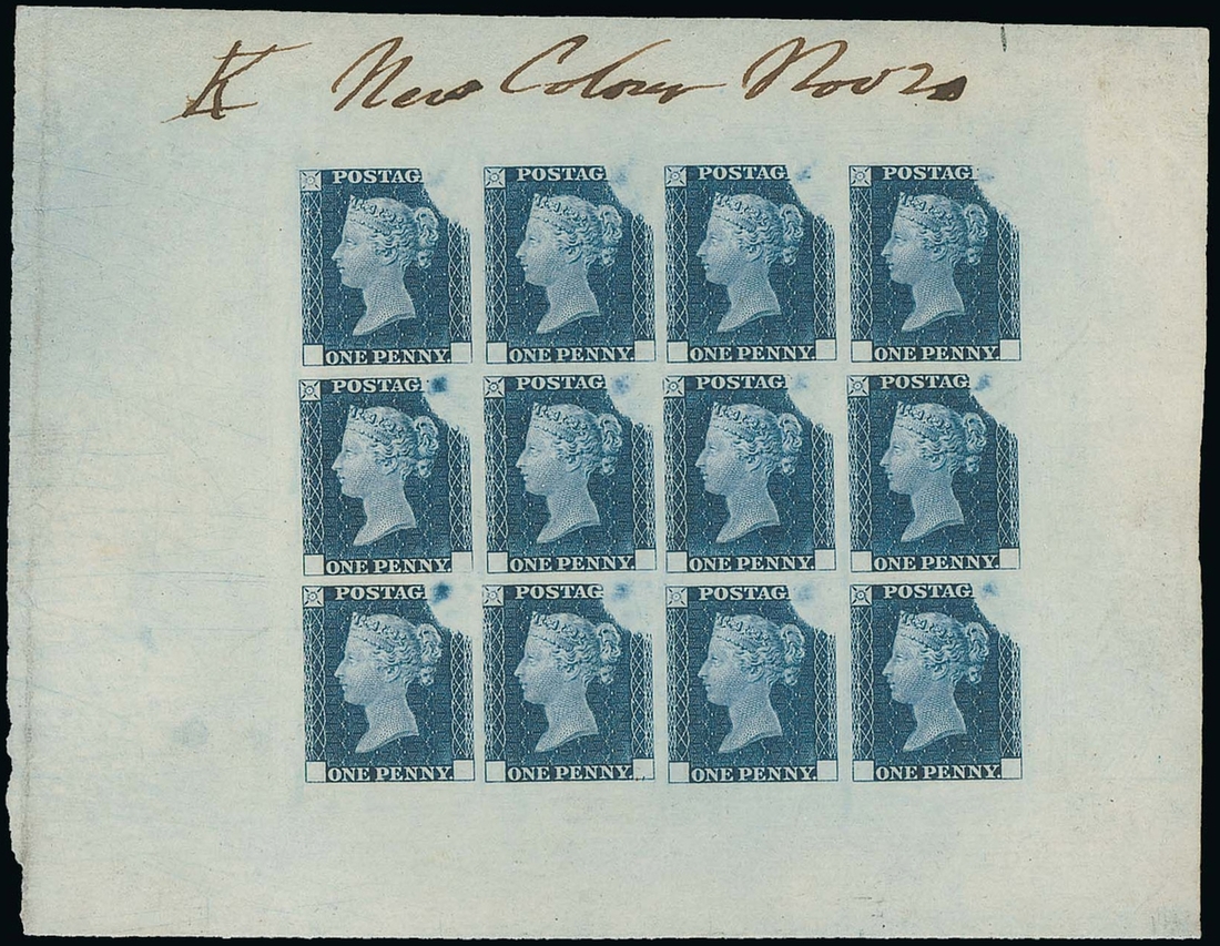 State 2/3: Complete sheet of twelve (4x3) in deep, dull blue on thin wove paper inscribed "K New Colour Nov. 20" in Bacon's hand;  some hinges on reverse otherwise fine and a rare piece.
