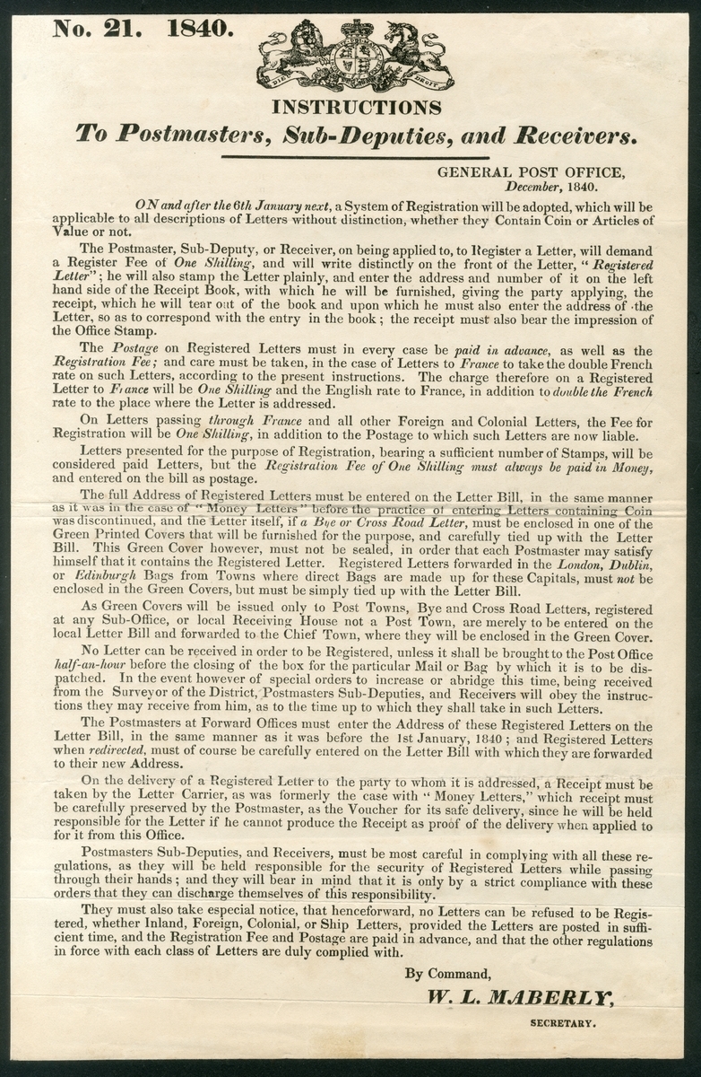 1840 (December) No. 21 titled "Instruction To Postmasters, Sub-Deputies, and Receivers" announcing the introduction of Registration - "On and after the 6th January next, a System of Registration will be adopted, which will be applicable to all descriptions of Letters without distinction, whether they Contain Coin or Articles of Value or not.".  Folded in a few places though in good overall condition and scarce.