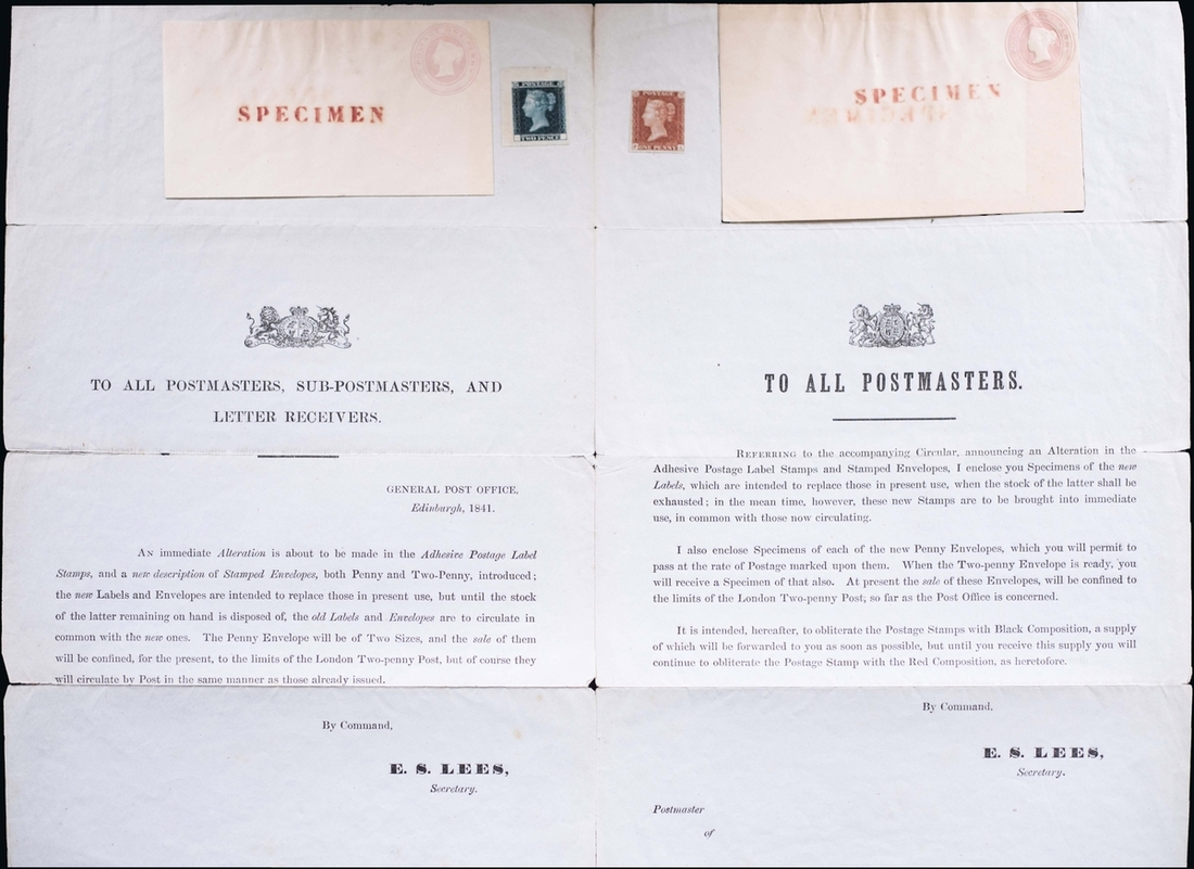 1841 notice issued by E.S. Lees, Secretary of the G.P.O. at Edinburgh "To all Postmasters, Sub-Postmasters, and Letter Receivers." announcing the issue of the new 1d. and 2d. stamps, in addition to stamped postal stationery envelopes; the notice printed over two sides, the left hand side bearing 1841-53 1d. red-brown, lettered FA, clear margins, just touching at lower left corner, the right side with 1841 2d. blue with void corner trial from the upper right of the setting, both sides with 1d. pink stationery envelope overprinted "