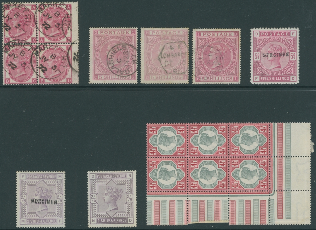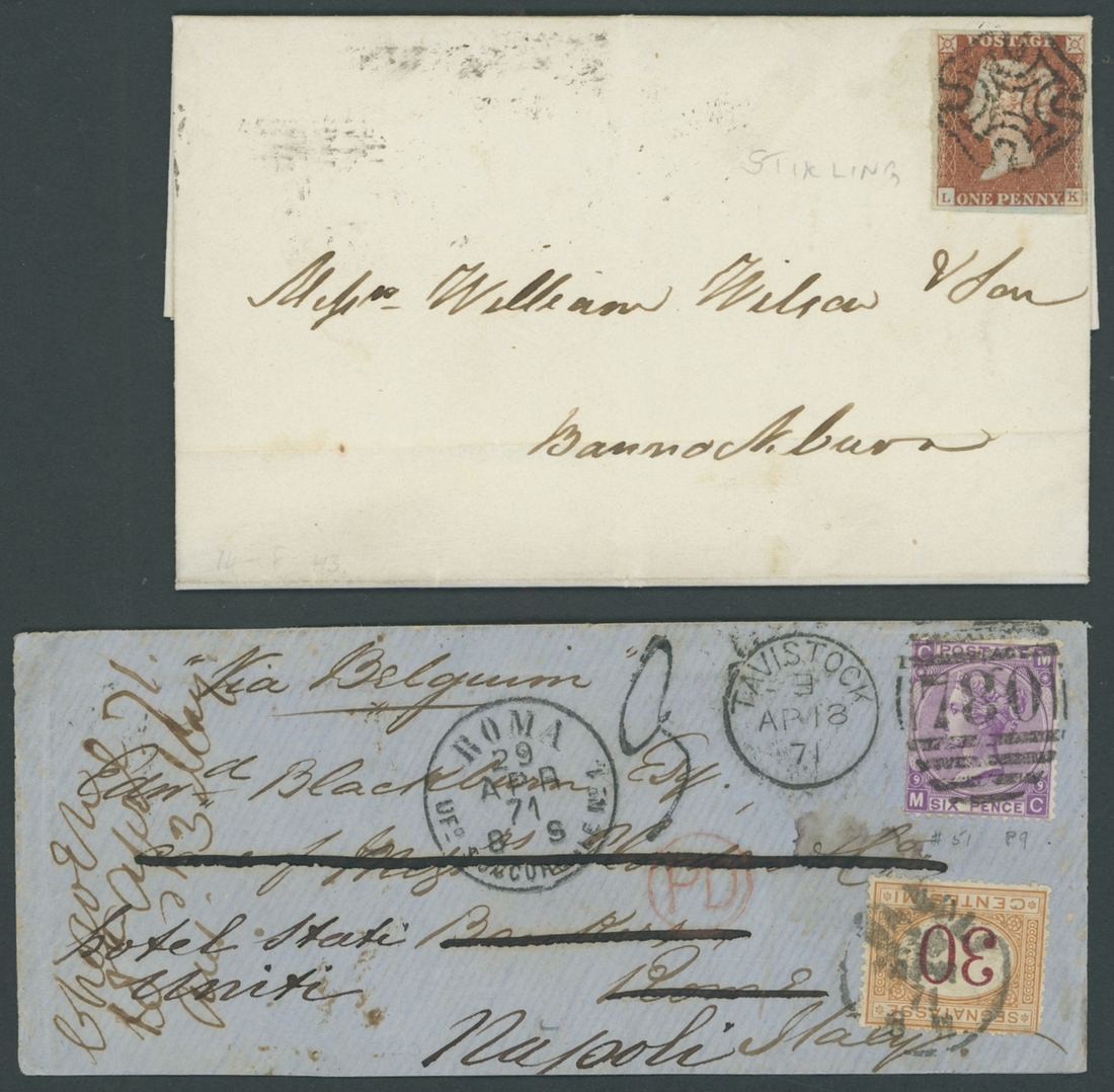1840-87, a small group including 1843 (14 Aug.) entire letter from Stirling to Bannockburn bearing 1841-53 1d. red-brown, LK, 1867-80 3d., Plate 8 AC-BD block of four with wing margin at right, cancelled by Market Hill 05.07.72 d.s., 1867-83 5/- pale rose (2) and rose, 1883-84 white paper 2/6d. overprinted "